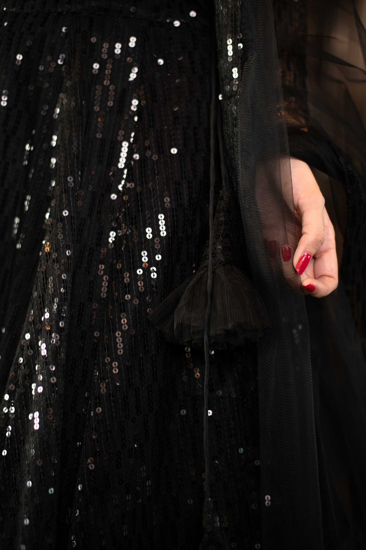 Trendia gets you Black sequin Lehnga Choli set in Chanderi by the brand Label Shaurya Sanadhya. This Black Lehnga set includes a sequin Lehnga and a sequin blouse with v-neck front and back and a tie-up dori at the back. The Indian Lehnga comes with a net dupatta with sequin border. This Lehnga skirt has a side tassle with a back closure and the blouse for women has full sleeves.
