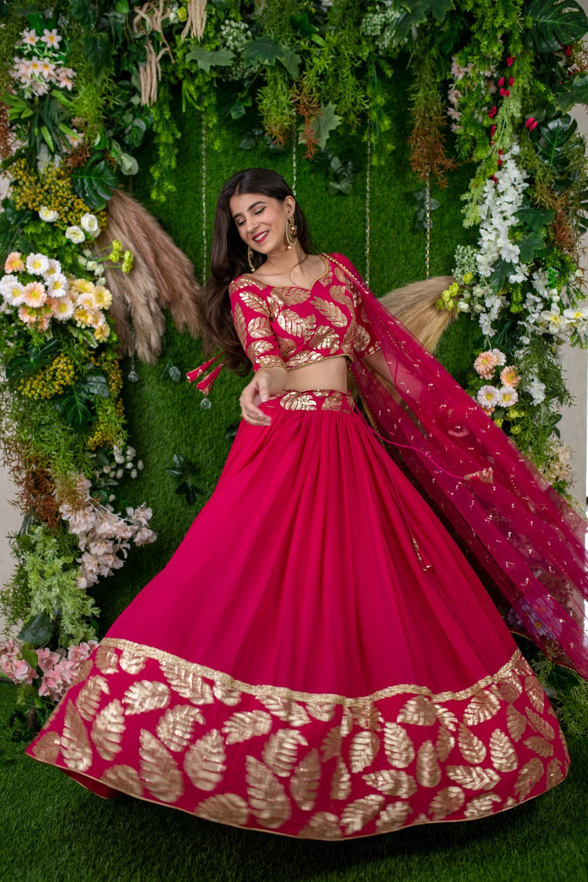This stunning rani pink lehenga outfit is ideal for use at parties and festivals, both during the day and at night. A rich border of sequin embroidery makes the lehenga more elegant. The blouse features the same embroidered pattern all over. The blouse boasts sweetheart detailing at the neckline and features half sleeves. A rani pink net dupatta is included with this ensemble as an accessory. The dupatta is laced on all four of its borders and features delicate sequin embroidery all over its surface.