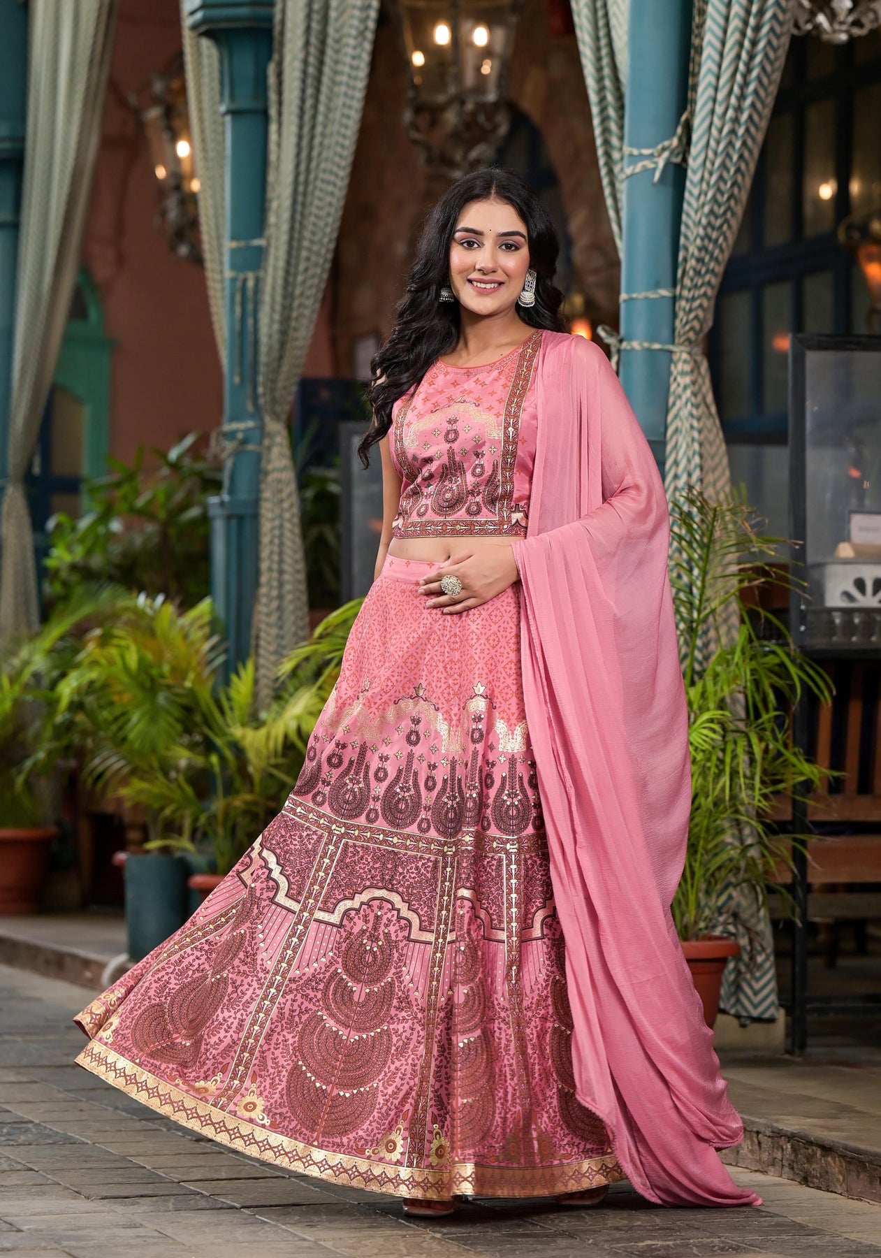 Onion Pink ethnic motif printed lehenga set adorned with sequins & gota Patti. The waist-length, sleeveless choli have a round neck & straight silhouette, paired with a printed skirt & solid dupatta.
