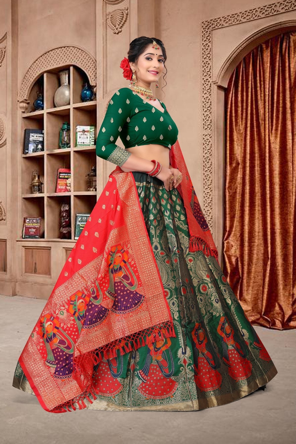 This beautiful jacquard lehenga choli is the epitome of elegance, perfect for festivals and special occasions. Get this beautiful jacquard zari woven lehenga choli online at trendia.co - The best online store for women's lehenga choli.