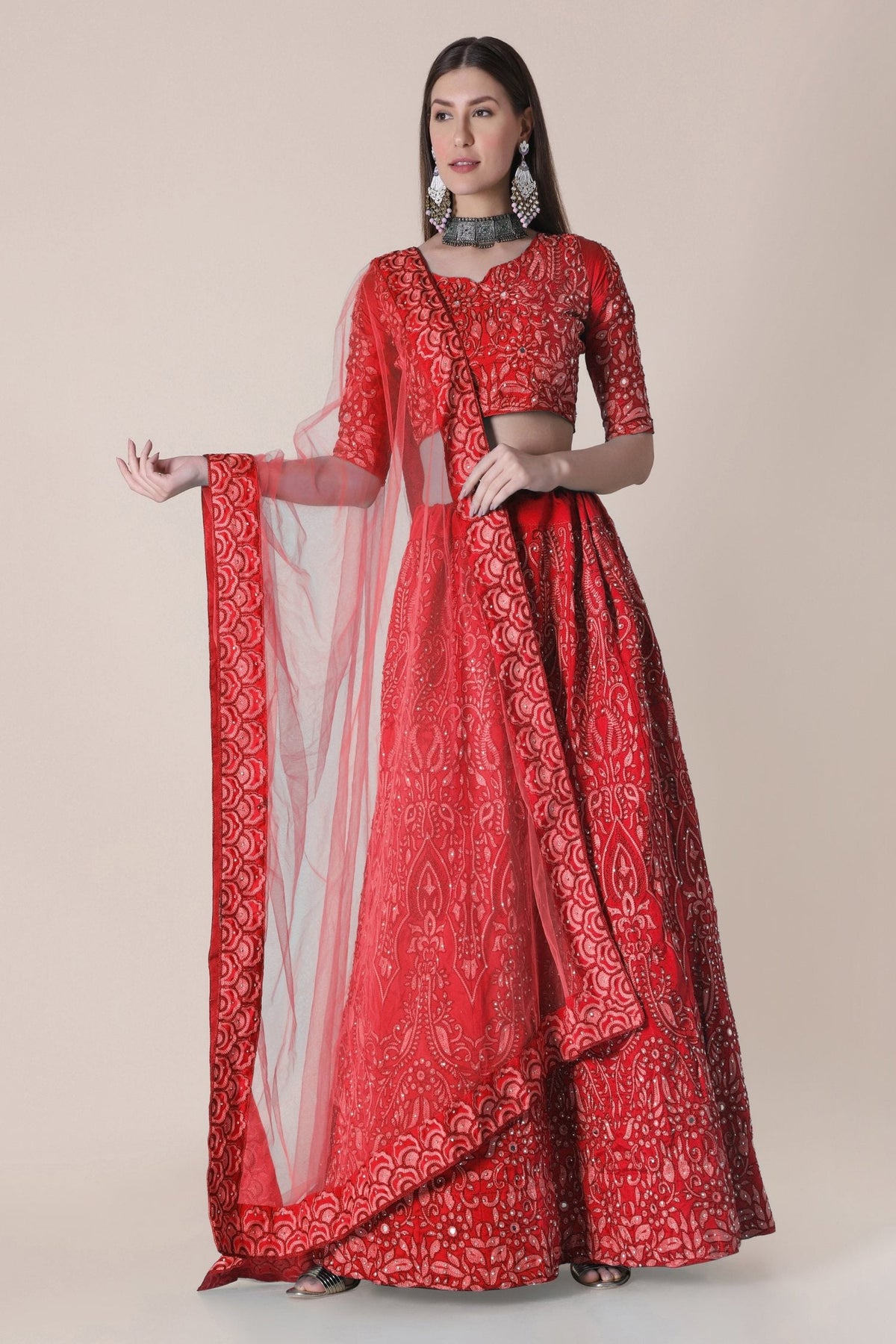 This beautiful taffeta silk lehenga choli is the epitome of elegance, perfect for festivals and special occasions. Get this beautiful taffeta silk thread embroidered lehenga choli online at trendia.co - The best online store for women's lehenga choli.