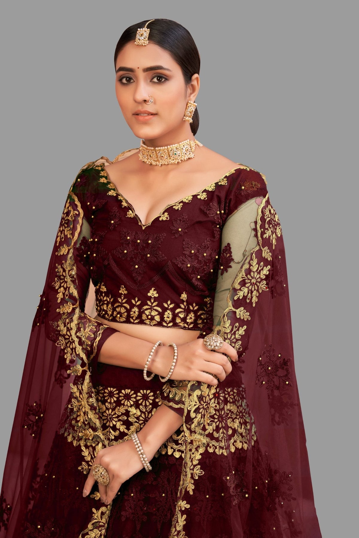 This beautiful net lehenga choli is the epitome of elegance, perfect for festivals and special occasions. Get this beautiful net thread embroidered lehenga choli online at trendia.co - The best online store for women's lehenga choli.