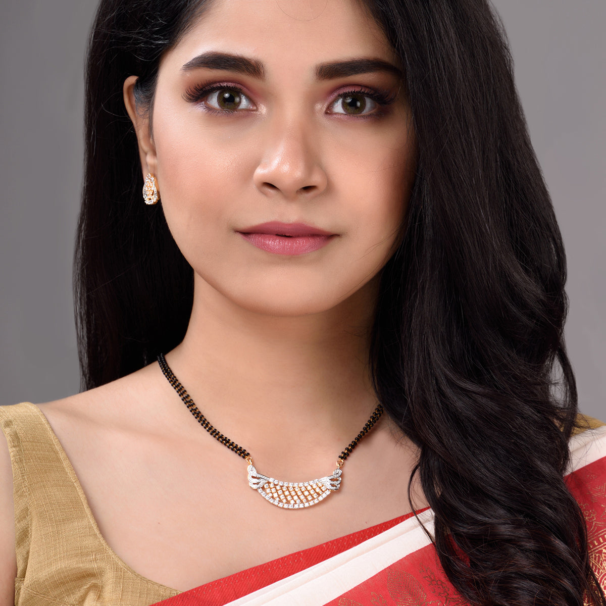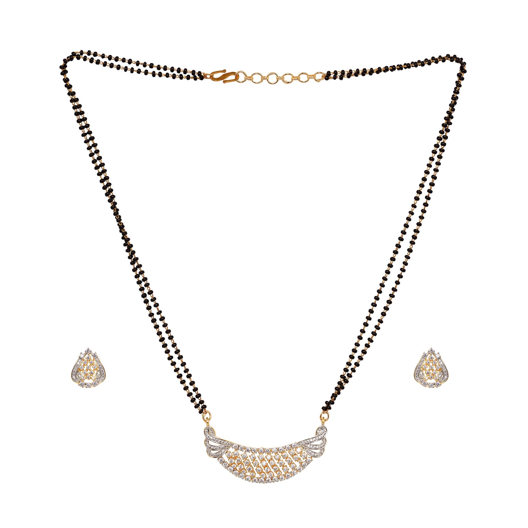 Handcrafted Western & ethnic Rhodium polish studded with Mangalsutra which completes your traditional look. The Pandent will go well with traditional or festive wear like Sarees, Anarkalis, Lehenga cholis & Salwar suites. This beautiful Handcrafted Mangalsutra set will fetch you lots of compliments & enhance your persona. The array of jewelry we present is the perfect blend of tradition and modernity that looks sophisticated yet conventional. A perfect gift on the occasions like Wedding, Ring ceremony, Engagement, Festival, Valentine's Day, Birthdays. Our Jewellery are made with high quality allergy free material. Wear it with your ethnic or party ensembles and keep your hair swept back for a glamorous look. This jewellery set consists of a Necklace and a pair of earrings. It is advisable to store Jewellery in a Jewellery pouch or in Jewellery organizer box. Keep away from chemicals, water and direct sunlight. Clean it with a dry and soft cloth or cotton.