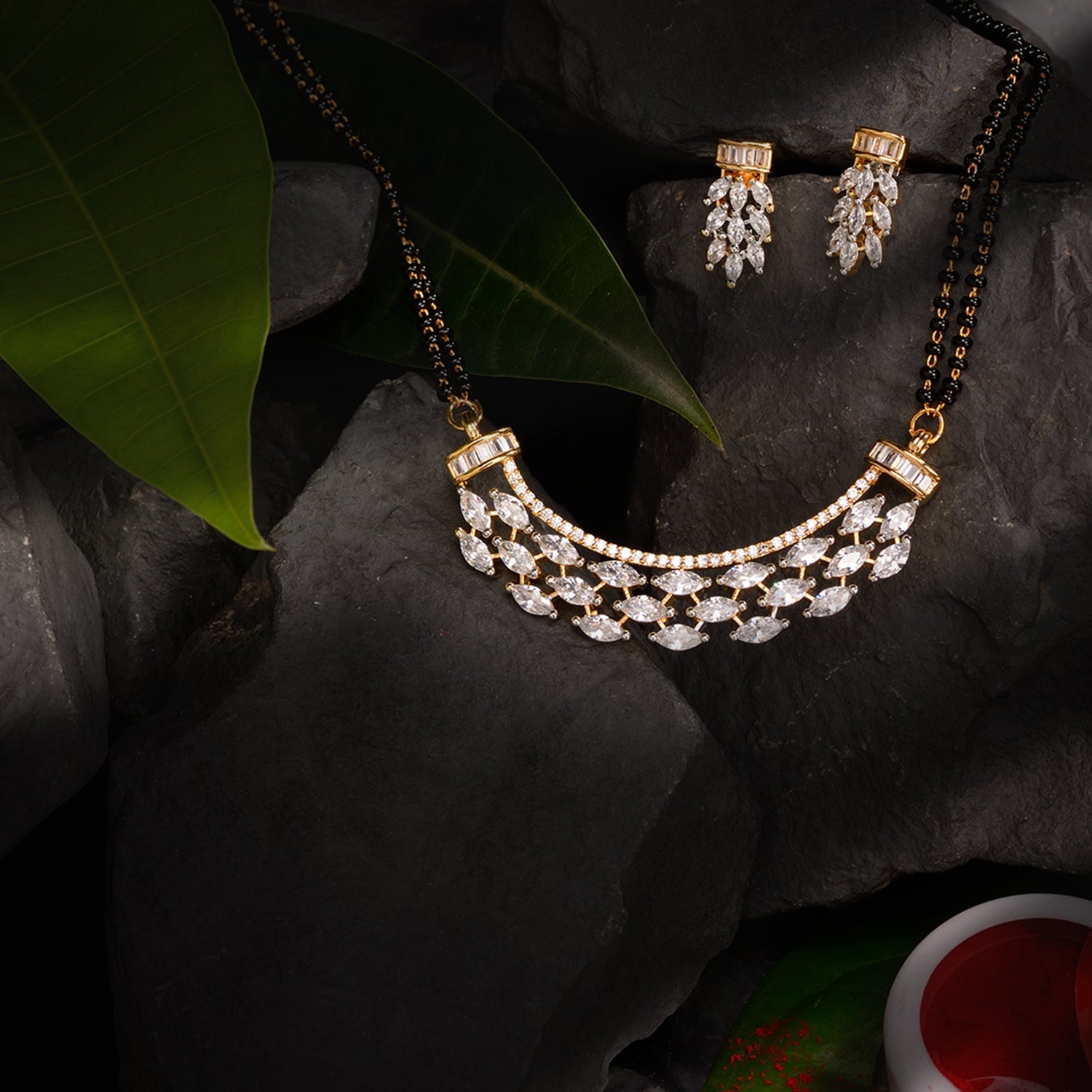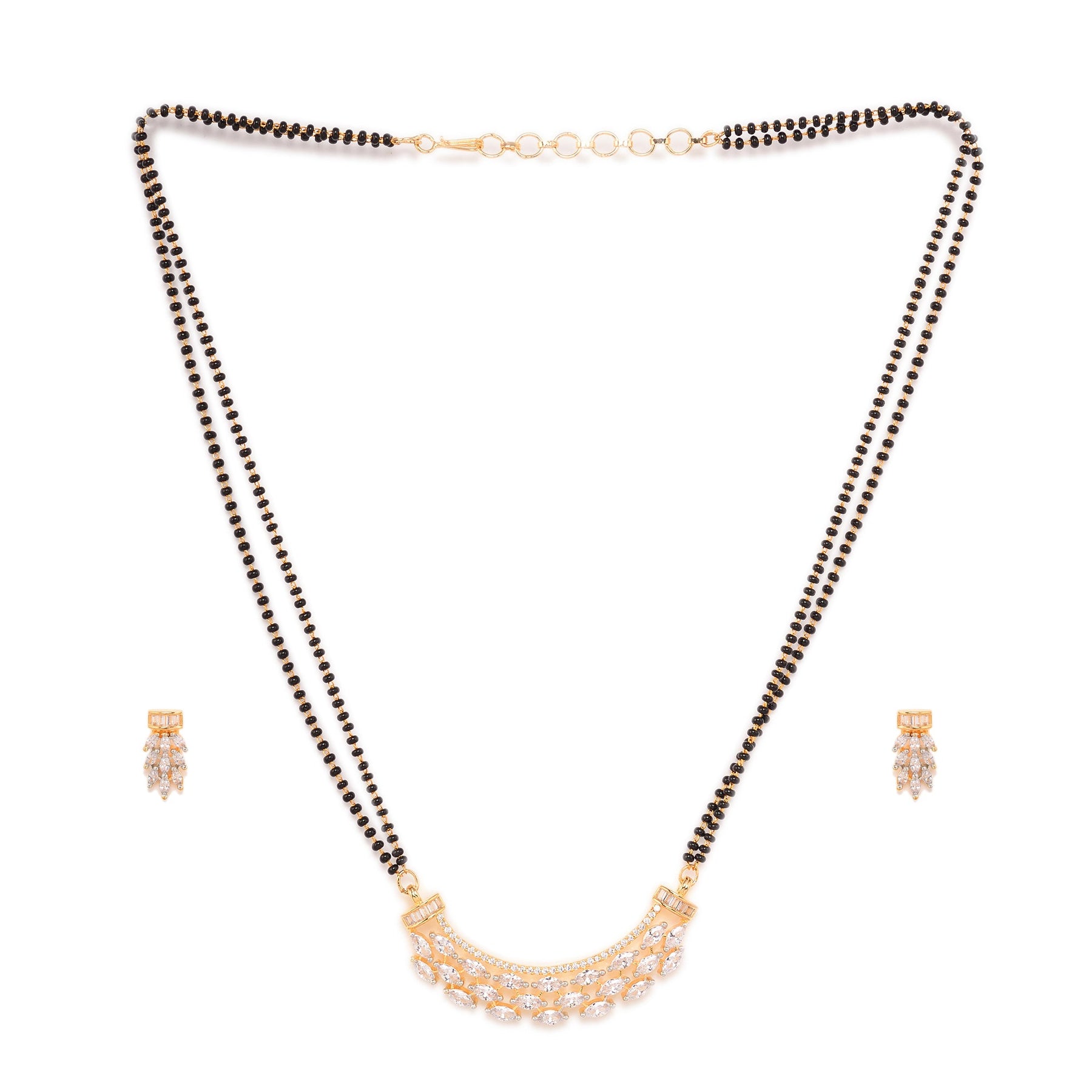 Handcrafted Western & ethnic Rhodium polish studded with Mangalsutra which completes your traditional look. The Pandent will go well with traditional or festive wear like Sarees, Anarkalis, Lehenga cholis & Salwar suites. This beautiful Handcrafted Mangalsutra set will fetch you lots of compliments & enhance your persona. The array of jewelry we present is the perfect blend of tradition and modernity that looks sophisticated yet conventional. A perfect gift on the occasions like Wedding, Ring ceremony, Engagement, Festival, Valentine's Day, Birthdays. Our Jewellery are made with high quality allergy free material. Wear it with your ethnic or party ensembles and keep your hair swept back for a glamorous look. This jewellery set consists of a Necklace and a pair of earrings. It is advisable to store Jewellery in a Jewellery pouch or in Jewellery organizer box. Keep away from chemicals, water and direct sunlight. Clean it with a dry and soft cloth or cotton.