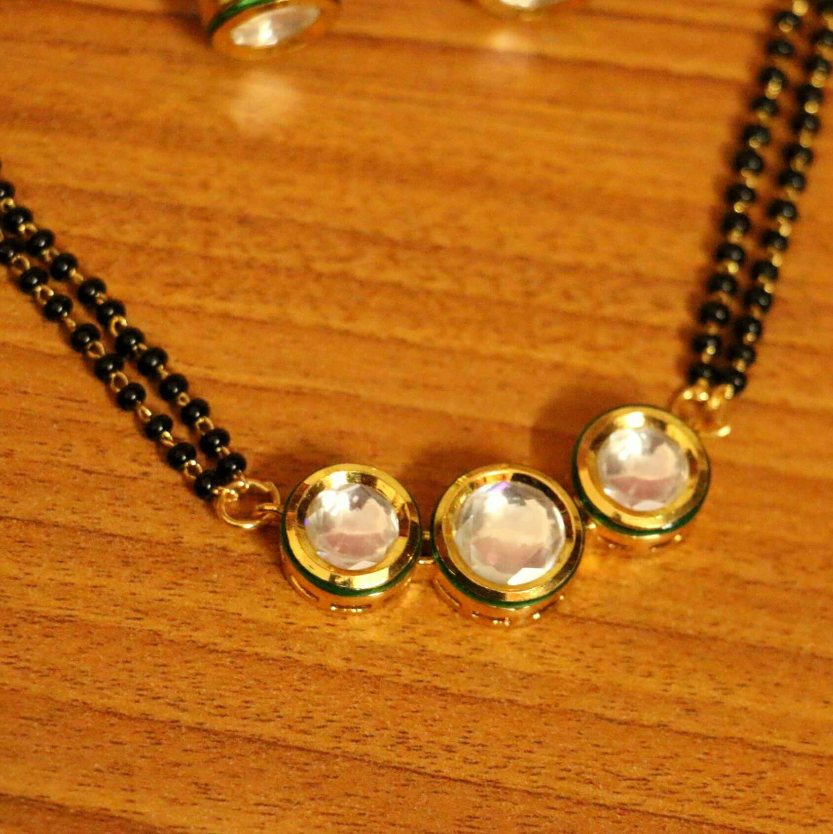 This Beautiful Mangalsutra Is Handcrafted In Brass Alloy With Imitation Kundan With Meenakari Work Of Very Fine Quality . This Mangalsutra Is Coated With 18 Kt Gold Polish Which Give Them A Unique Look . An Absolutely Stunning Piece To Own And Are Very Light In Weight.