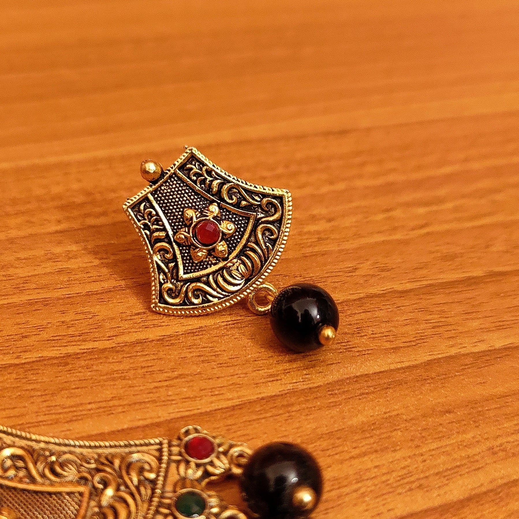 This Beautiful Antique Gold Polki Mangalsutra Is Handcrafted In Copper Alloy With Imitation Red & Green Colour Stone And Black Colour Beads Of Very Fine Quality , This Mangalsutra Is Coated With 18 Kt Nickle Free Antique Gold Plating To Avoid Skin Allergies And Its Very Light In Weight .