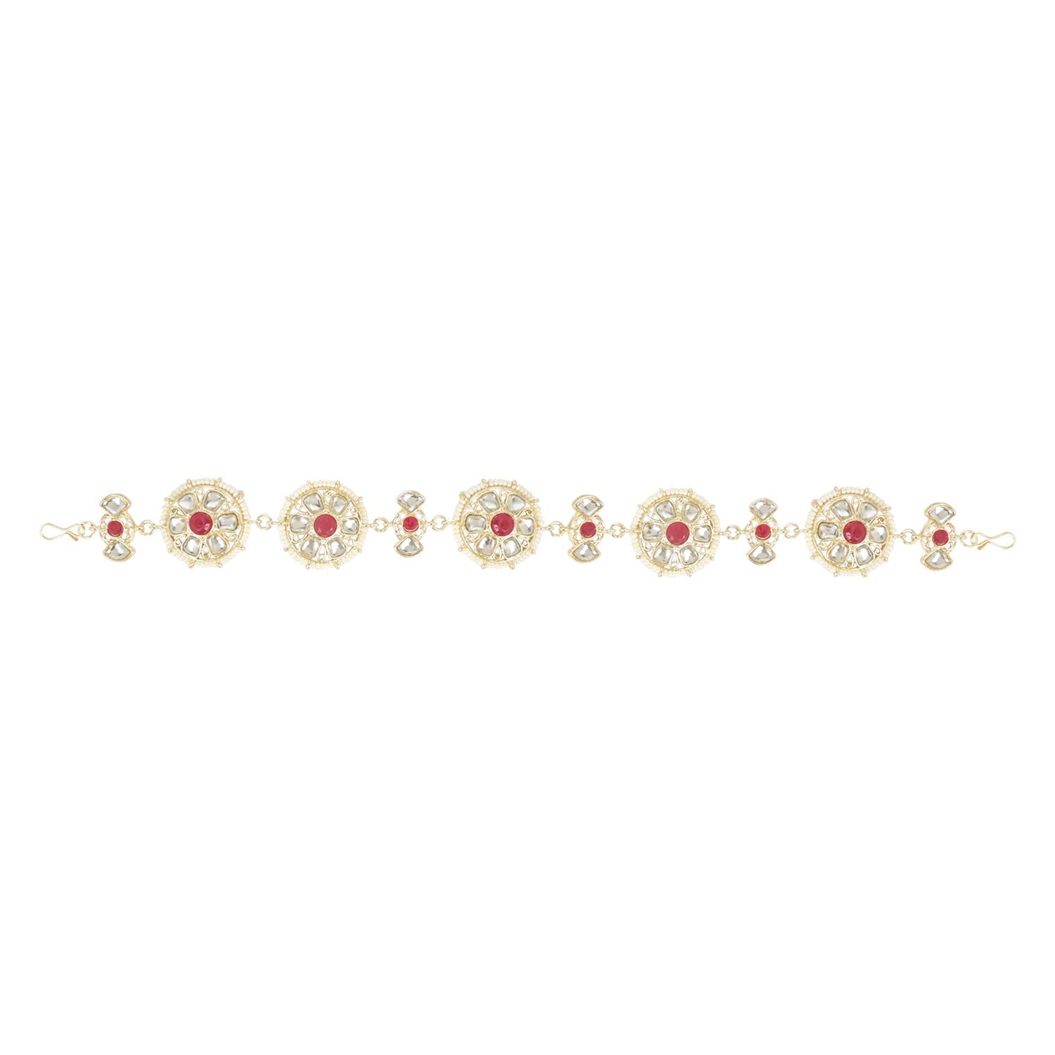 This Is A Stunning And Traditional Piece Of Jewelry That Showcases Intricate Craftsmanship And Luxurious Materials. The Piece Features A Floral Design That Is Inspired By The Traditional Rajasthani Style, Which Is Known For Its Bold And Intricate Motifs. The Base Material Of The Jewelry Is Gold-Plated, Which Adds A Lustrous And Rich Look To The Piece. The Gold Plating Also Ensures That The Piece Is Long-Lasting And Durable. The Floral Design Is Then Embellished With Kundan. The Kundan Stones Used In This Piece Are Of High Quality And Add A Sparkling And Elegant Touch To The Overall Design. In Addition To The Kundan Stones, The Piece Is Also Studded With Pearls, Which Are Known For Their Classic And Timeless Beauty. The Pearls Used In This Piece Are Of High Quality And Have A Lustrous And Smooth Surface That Adds To The Overall Luxurious Look Of The Jewelry. Overall, This Piece Is A Beautiful And Traditional Addition To Any Jewelry Collection. Its Intricate Design, High-Quality Materials, And Attention To Detail Make It A True Work Of Art. Whether Worn For A Special Occasion Or As An Everyday Accessory, This Jewelry Is Sure To Make A Statement And Leave A Lasting Impression.