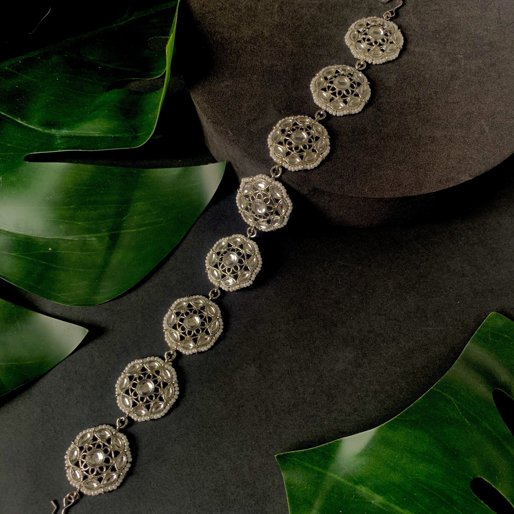 This Is A Stunning And Traditional Piece Of Jewelry That Showcases Intricate Craftsmanship And Luxurious Materials. The Piece Features A Floral Design That Is Inspired By The Traditional Rajasthani Style, Which Is Known For Its Bold And Intricate Motifs. The Base Material Of The Jewelry Is Silver-Plated, Which Adds A Lustrous And Rich Look To The Piece. The Silver Plating Also Ensures That The Piece Is Long-Lasting And Durable. The Floral Design Is Then Embellished With Kundan. The Kundan Stones Used In This Piece Are Of High Quality And Add A Sparkling And Elegant Touch To The Overall Design. In Addition To The Kundan Stones, The Piece Is Also Studded With Pearls, Which Are Known For Their Classic And Timeless Beauty. The Pearls Used In This Piece Are Of High Quality And Have A Lustrous And Smooth Surface That Adds To The Overall Luxurious Look Of The Jewelry. Overall, This Piece Is A Beautiful And Traditional Addition To Any Jewelry Collection. Its Intricate Design, High-Quality Materials, And Attention To Detail Make It A True Work Of Art. Whether Worn For A Special Occasion Or As An Everyday Accessory, This Jewelry Is Sure To Make A Statement And Leave A Lasting Impression.