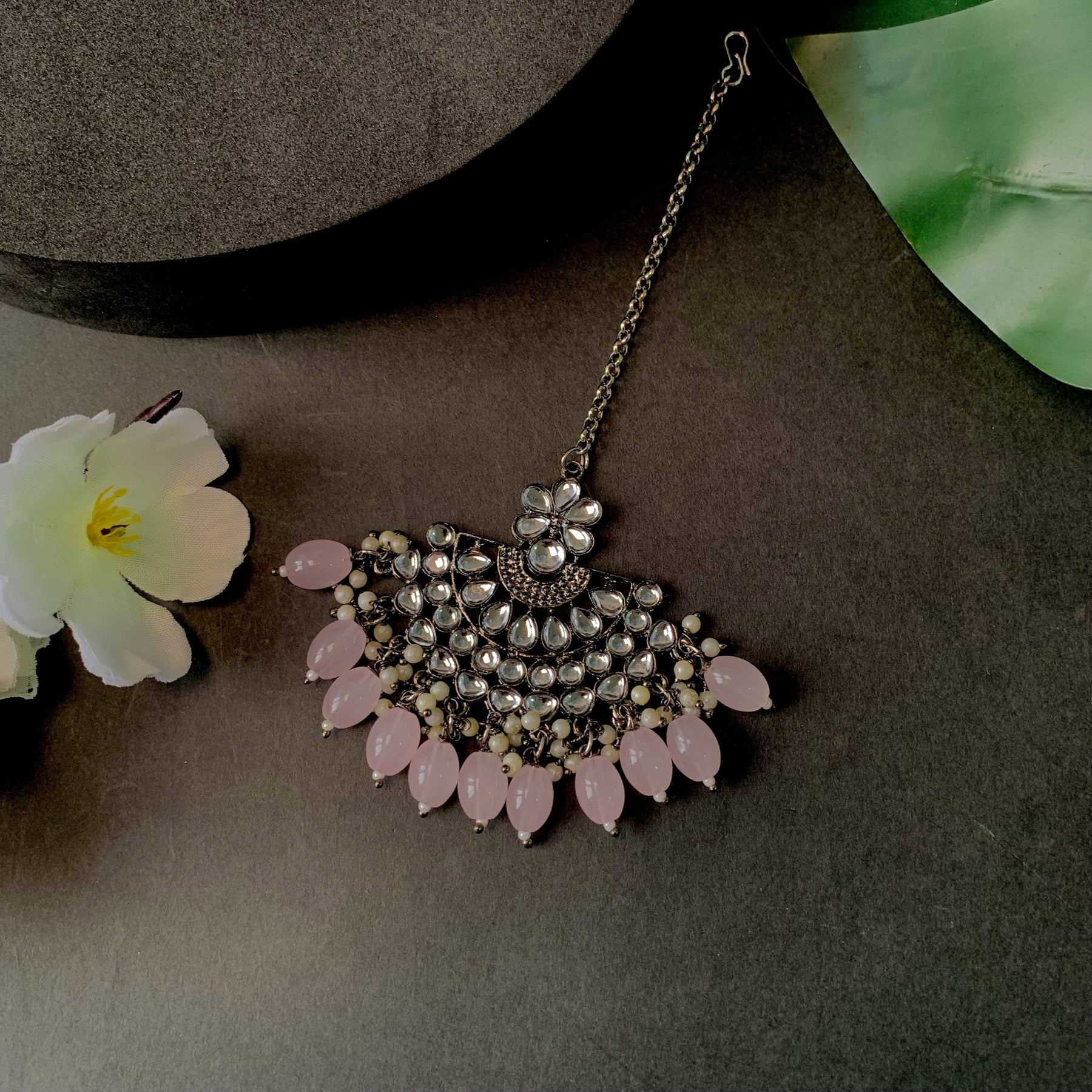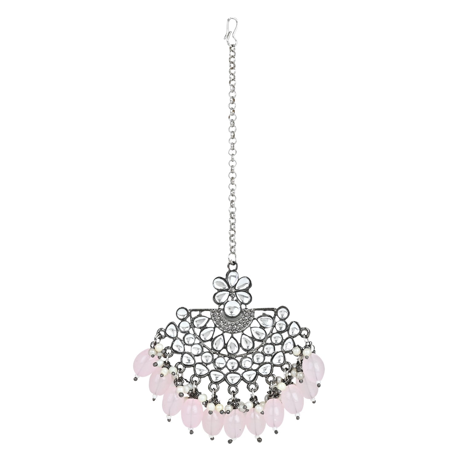 The Silver Oxidized Kundan Pearl Maang Tikka Is A Stunning Piece Of Jewelry That Enhances The Beauty Of Traditional Indian Outfits. This Accessory Is Made From High-Quality Silver And Has An Antique Look. It'S Decorated With Pretty Kundan Work And Delicate Pearls, Adding Elegance To Your Appearance. You Can Easily Wear It On Your Forehead, And It Stays In Place Comfortably. This Maang Tikka Is Versatile And Suits Various Occasions, From Weddings To Cultural Events. Its Timeless Design Ensures It Remains A Cherished Part Of Your Jewelry Collection For A Long Time, Always Adding A Touch Of Beauty To Your Look.