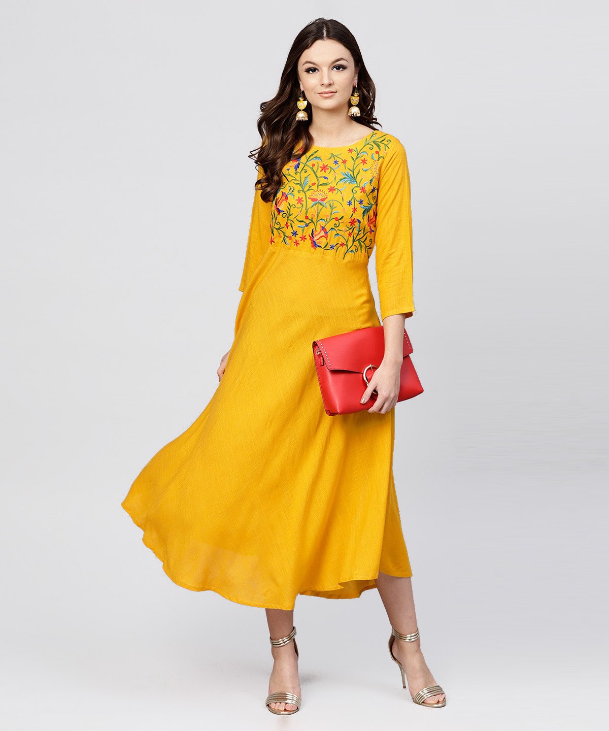 Yellow Round Neck Embroidered Full Sleeves Rayon Maxi Dress Color : Yellow Fabric:Rayon Wash Care :Machine Wash