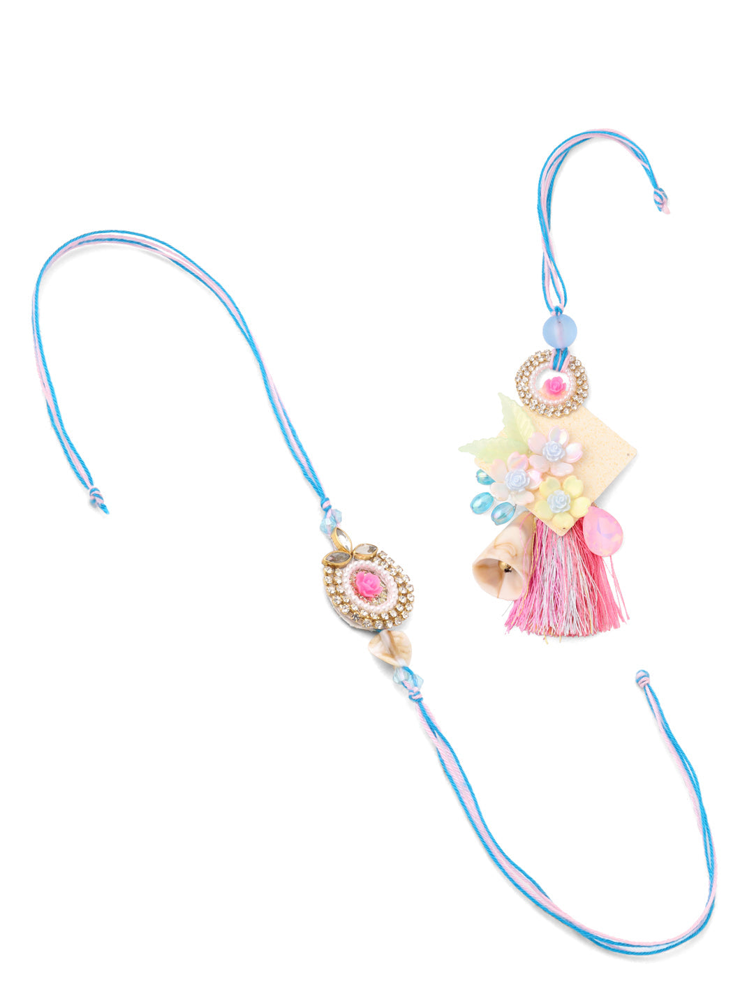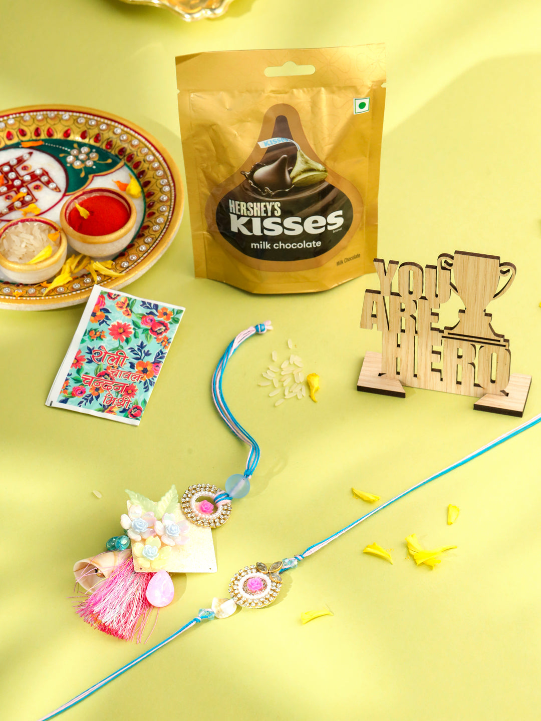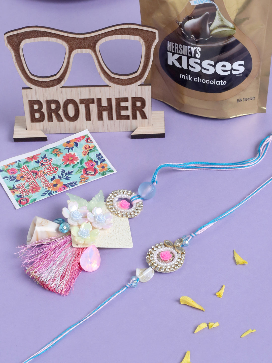 Style Note: Celebrate The Joyous Occasion Of Raksha Bandhan With The Nvr Set Of 2 Multicolor Artificial Stones & Beads Floral Design Rakhis For Bhaiya And Bhabhi. These Rakhis Are Beautifully Crafted With Artificial Stones And Beads, Adding A Festive And Elegant Touch. The Intricate Floral Design Symbolizes Love, Care, And Blessings For Both Your Brother And Sister-In-Law. Complete With Roli, Chawal, Chandan, Mishri With Assorted Mdf Wooden Stand & 33.6 Gm Hershey'S Kisses Chocolate, This Set Ensures A Traditional And Heartfelt Celebration. Thoughtfully Designed To Reflect The Essence Of Raksha Bandhan, This Set Is The Perfect Gift. Make Your Celebration Special With These Charming And Meaningful Rakhis.