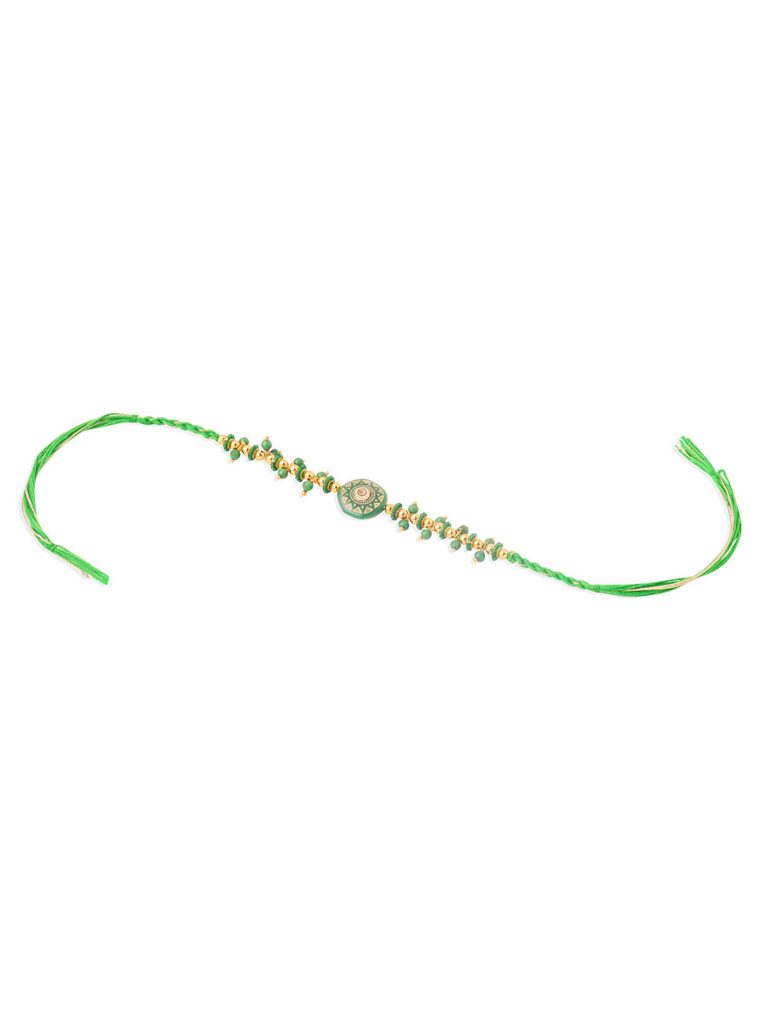 Style Note: Celebrate Raksha Bandhan With The Nvr Men Green Artificial Beads Round Shape Thread Rakhi. Featuring A Vibrant Green Artificial Beads Design In A Classic Round Shape, This Rakhi Adds A Touch Of Elegance And Tradition. Perfect For Your Bhaiya, It Symbolizes Love, Protection, And Well-Wishes. The Adjustable Thread Ensures A Comfortable Fit For All Wrist Sizes. The Set Includes Roli, Chawal, Chandan & Mishri, Allowing You To Complete The Traditional Raksha Bandhan Rituals. A Meaningful And Thoughtful Gift To Express Your Love And Blessings On This Special Day.