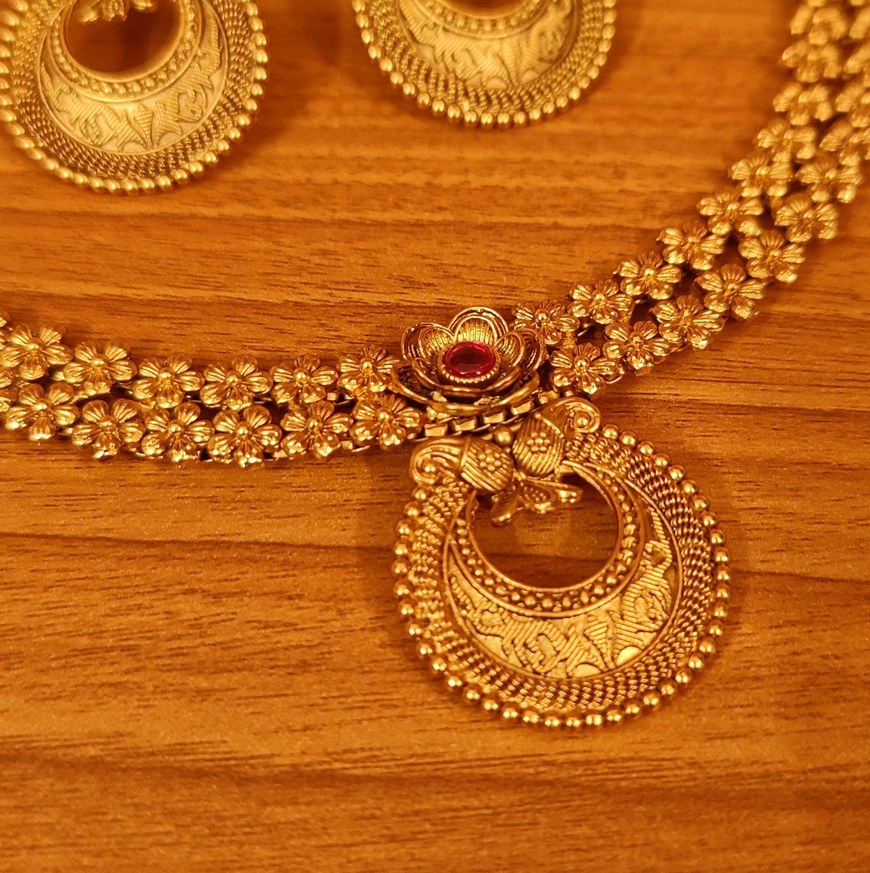 This Beautiful Flower Patter Necklace Set Is Handcrafted In Copper Alloy With Imitation Red Colour Stone &Amp; Gold Polki Work Of Very Fine Quality . This Necklace Set Is Coated With 18 Kt Gold Rhodium Plating That Gives A Real Gold Look . An Absolutely Stunning Piece To Own And Are Light In Weight.