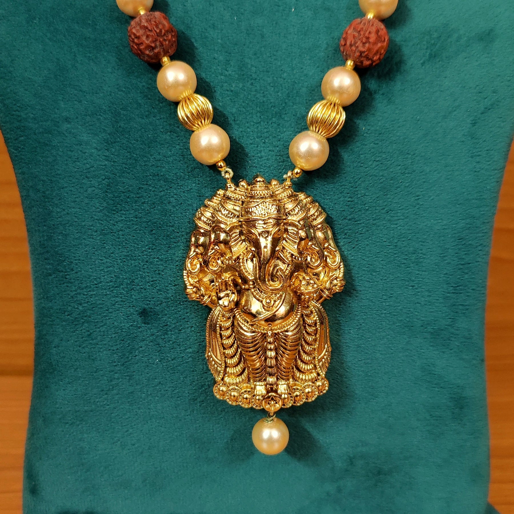 This Craftsmanship Evokes The Aesthetic Of A Grand Temple, With Its Exquisite Combination Of High-End Polki, Temple Look, Lustrous Pearls, And Gold Beads. The Magnificent Rudraksh Adds An Aura Of Magnificence And Exclusivity To The Temple Look Pearl &Amp; Rudraksh Necklace Set.