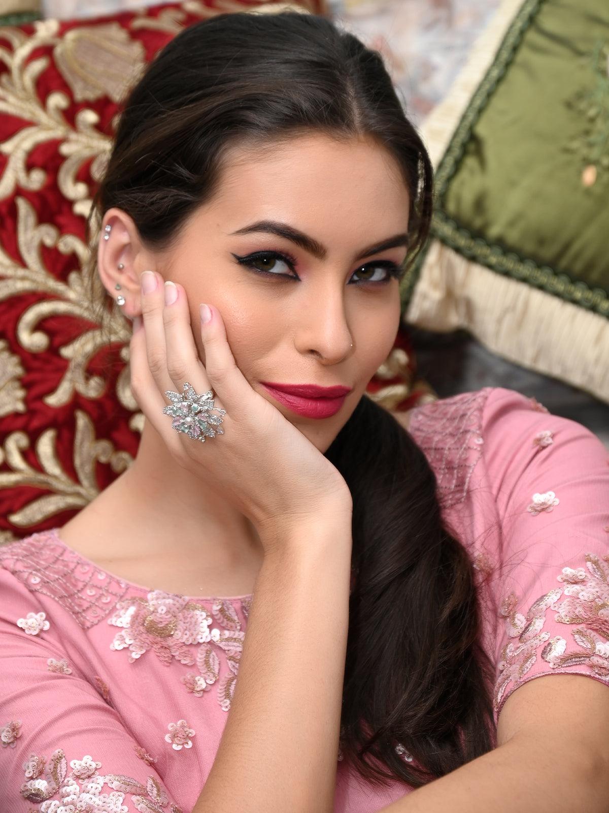 This royal piece of jewellery is a show-stopper. Flaunt it in your finger to see all the heads turning to you. 1. German Rhodium Finish 2. White Austrian Diamond Stones 3. Blue and pink stones add the drama to the already beautiful finger ring