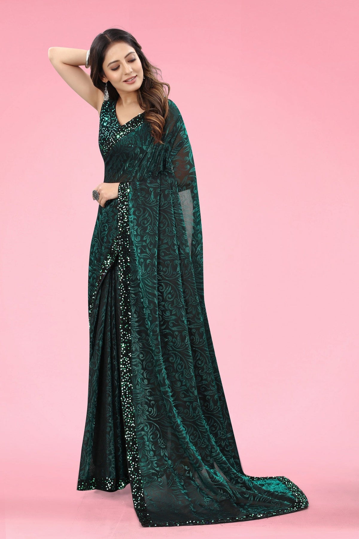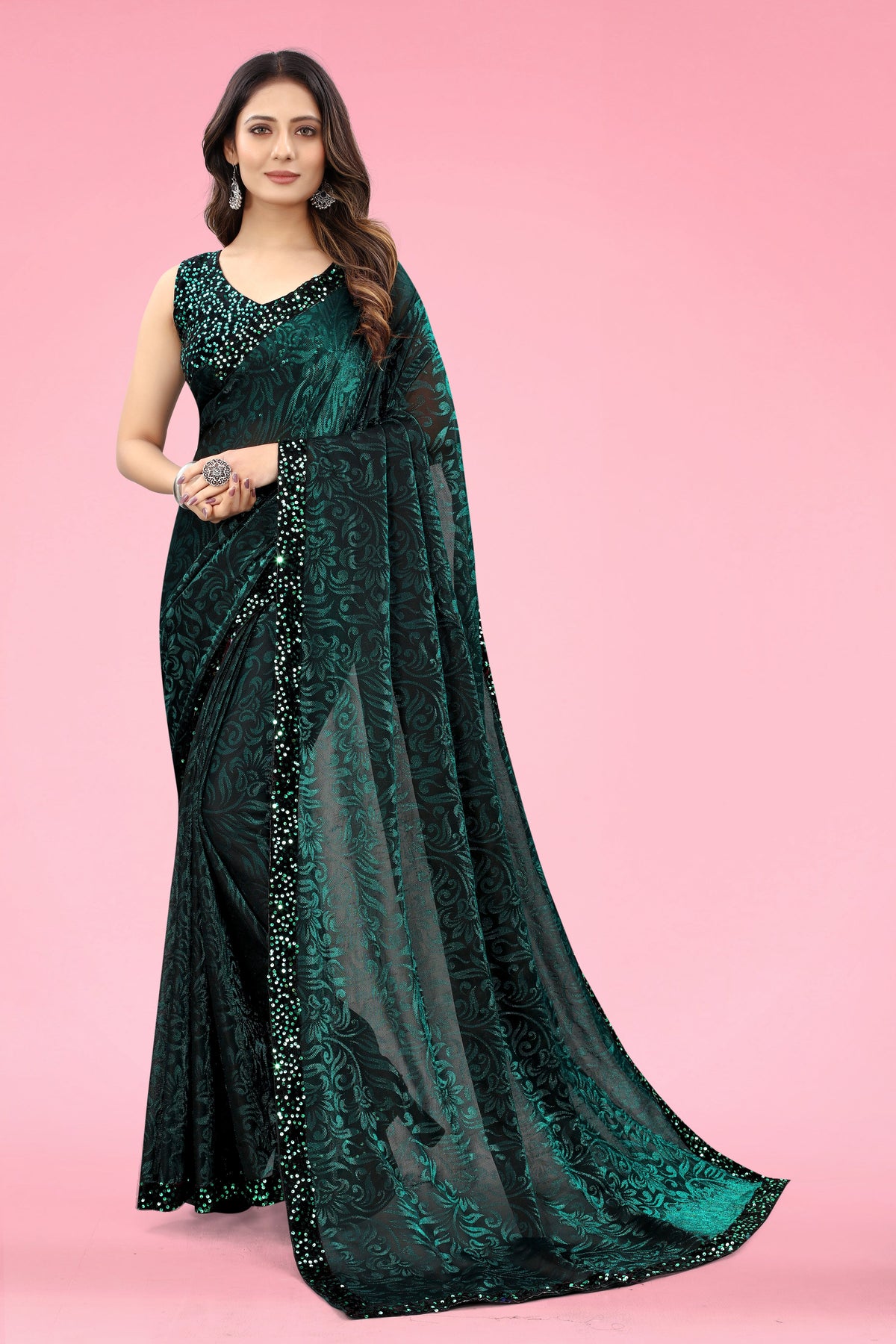 Pattern Embellished Pack Of-1 Occasion Casual, Party & Festive, Wedding Decorative Material Ruffle Embroidery Method Machine Fabric Care Dry Clean For The First Wash, Thereafter Hand Wash, Do Not Iron On Print/Embroidery/Embellishment, Do Not Dry Cleanfabric Lycra Blend Type Fashion Blouse Piece Unstitched Sari Style Regular Sari Sari Length 5.5M Blouse Piece Length 0.8 M Weight 0.375 Kg