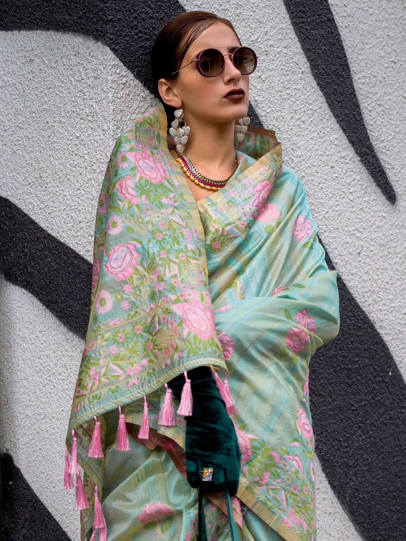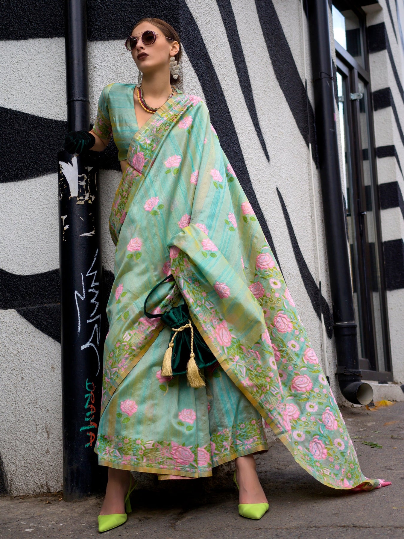 Women's Cotton Blend Sea Green Woven Design Designer Saree With Blouse Piece