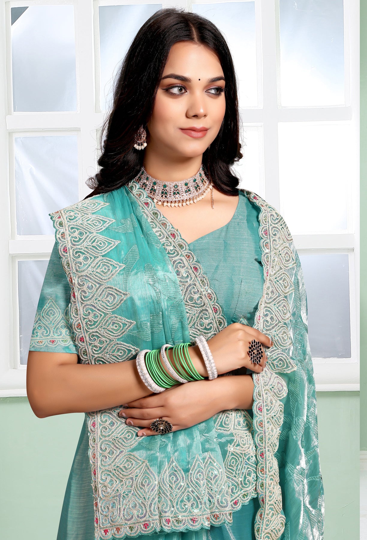 Women's Dusty Sky Jimmy Choo Silk Sequence Embroidery Saree - PR Fashion