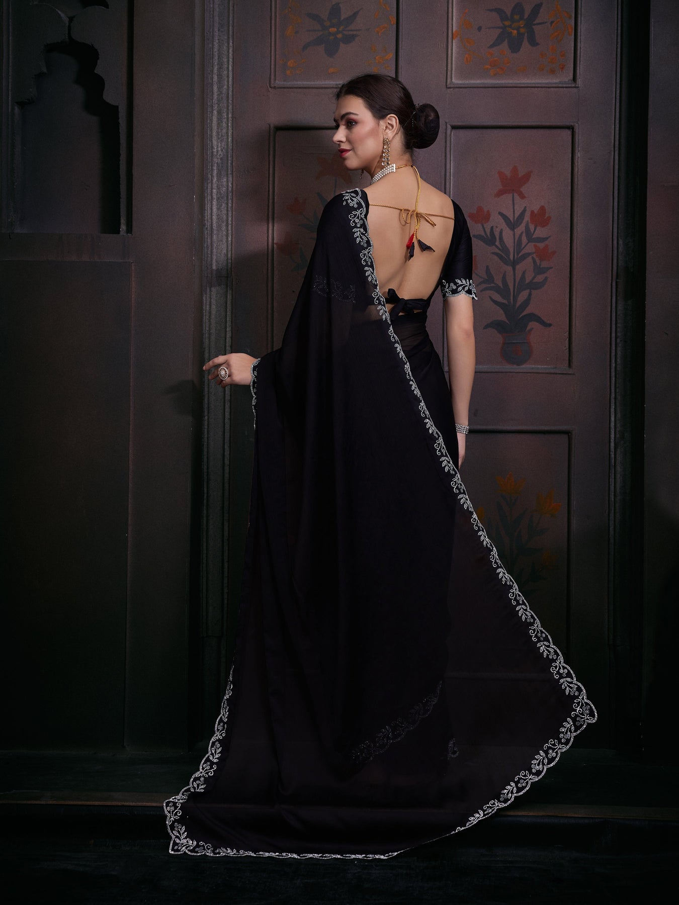 Women's Black Pure Chiffon Zircon Cutwork Saree - PR Fashion