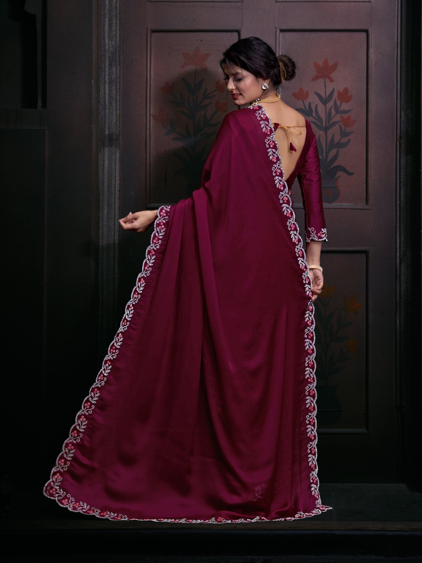 Women's Maroon Pure Chiffon Zircon Cutwork Saree - PR Fashion