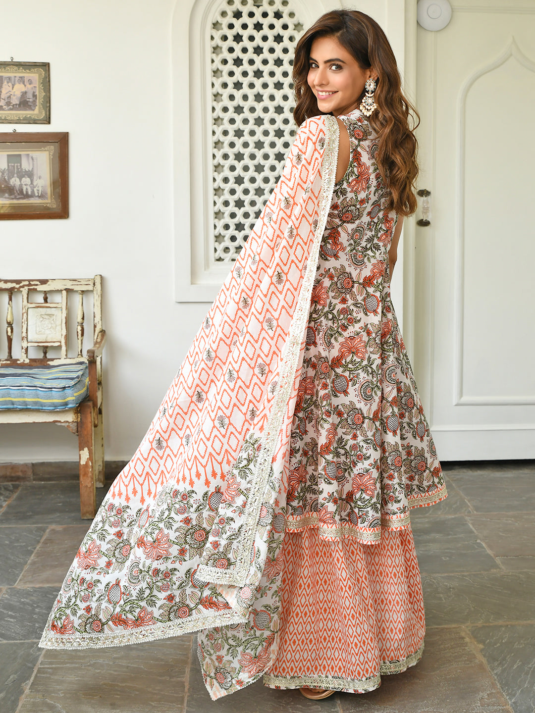 Dress This Season With A White And Orange Floral Hand Block Printed Sharara Set. The Set Is Crafted In Cotton Fabric And It Features Lace Work Detailing At The Hemline, Round Neckline, With Flared Silhouette. The Sharara Has Orange Chevron Prints All Over To Enhance The Look And The Dupatta Is Also Designed With Lace Detailing At The Borders.