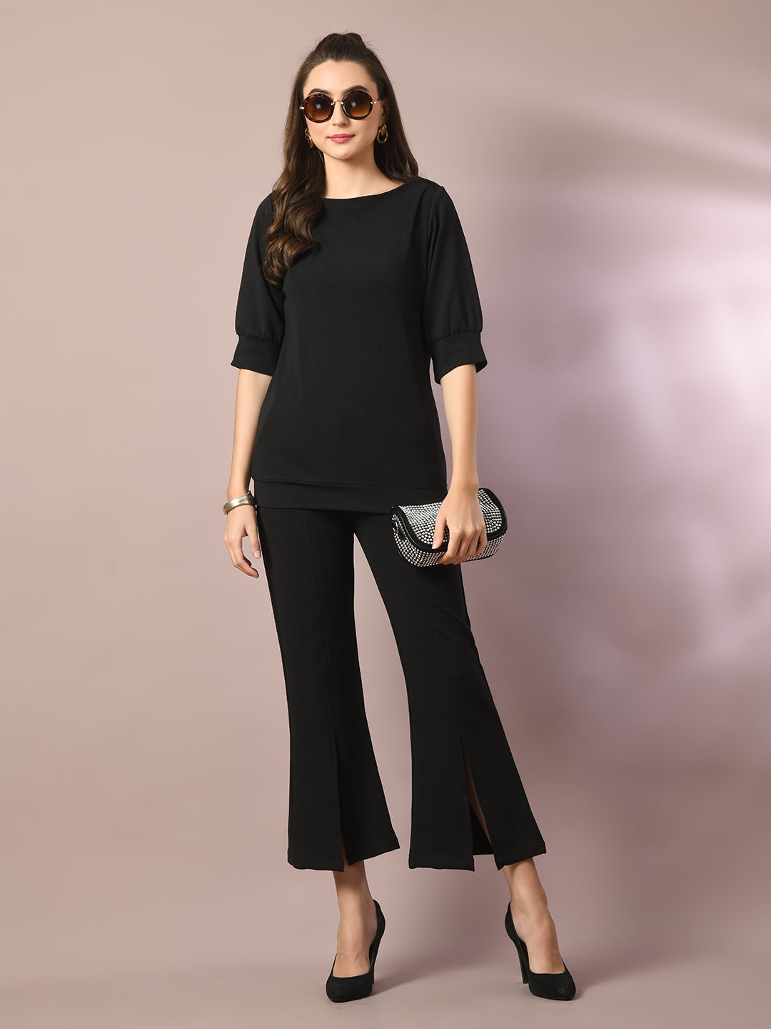 Women Black Solid Boat Neck Party Top