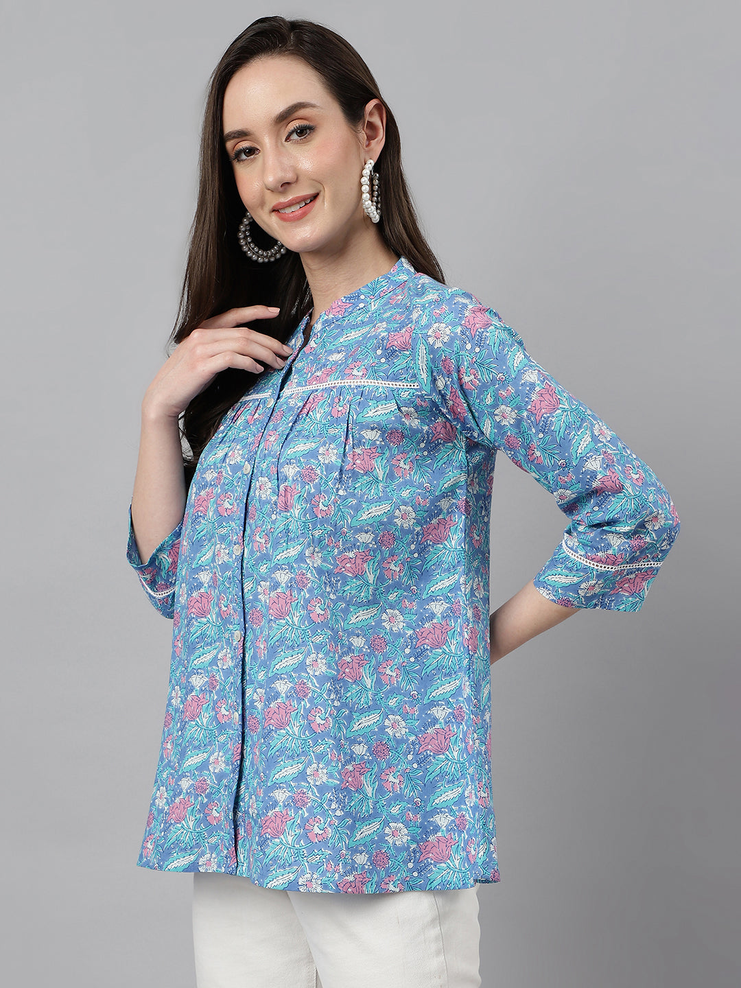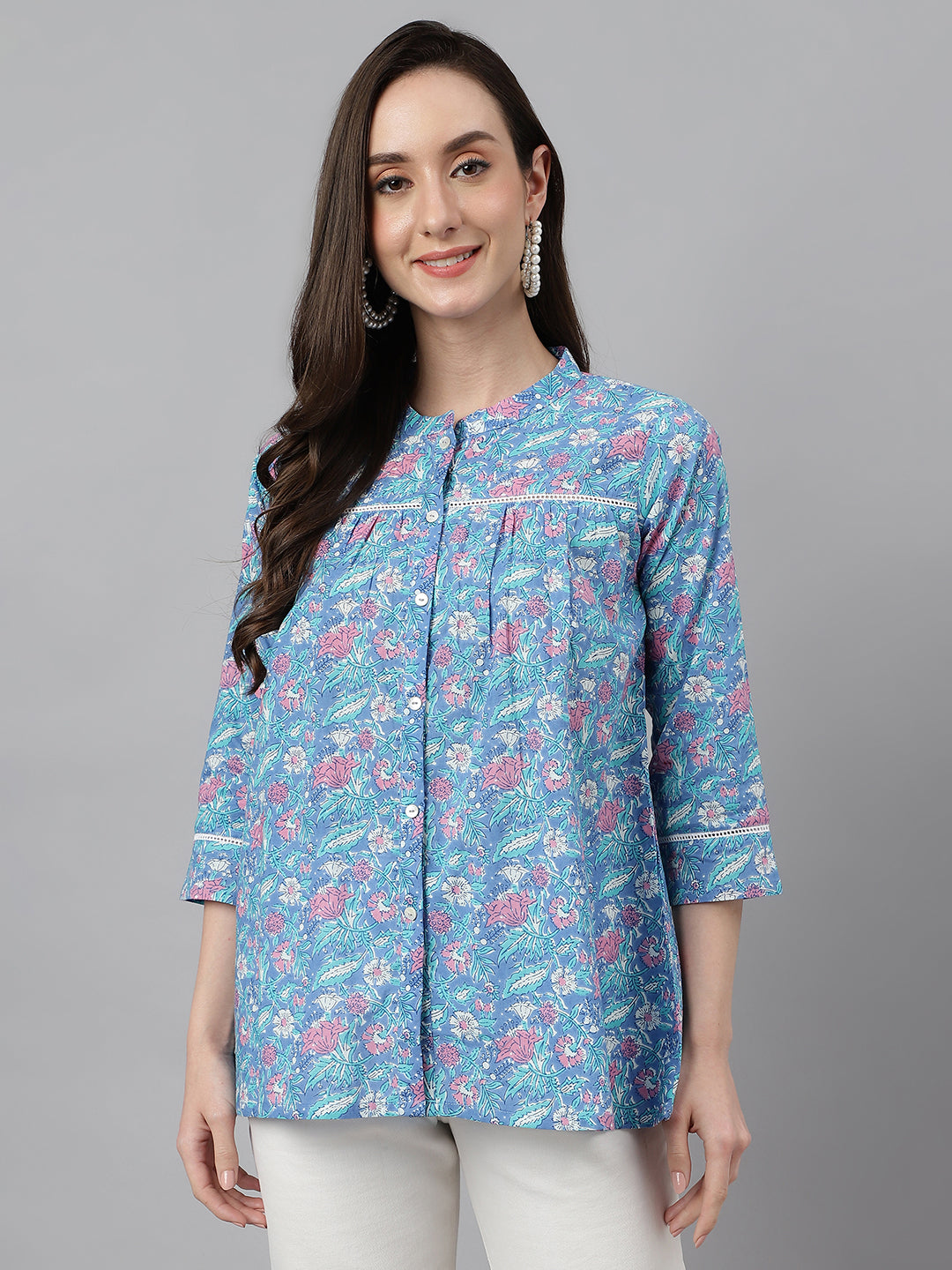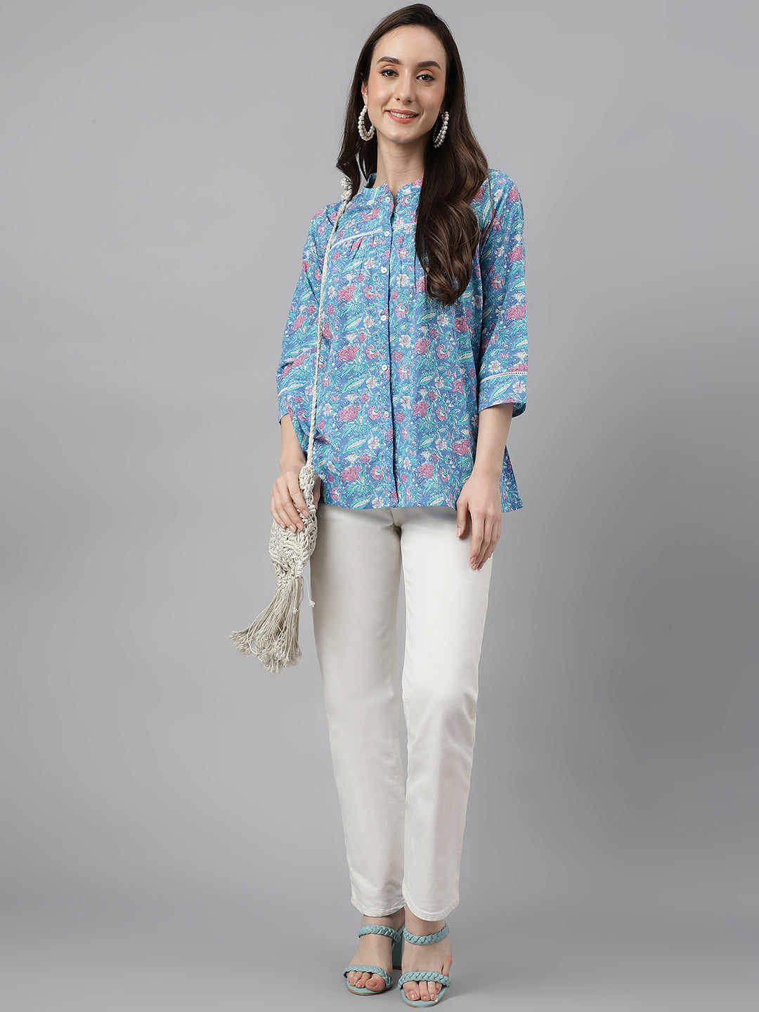Botanical Print Blue Cotton Tops Pattern :Botanical Print Style :Empire Sleeve Type ;Regular Sleeves Neck Type : Mandarin Collar Color :Blue Fabric :Cotton Wash Care :Hand Wash