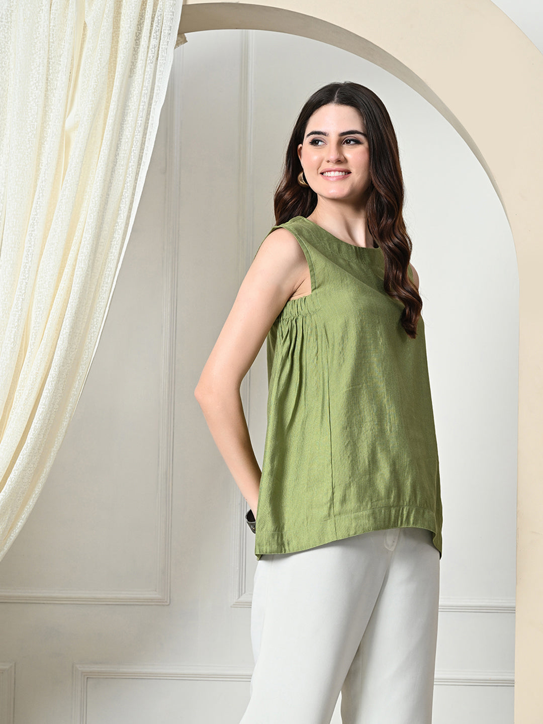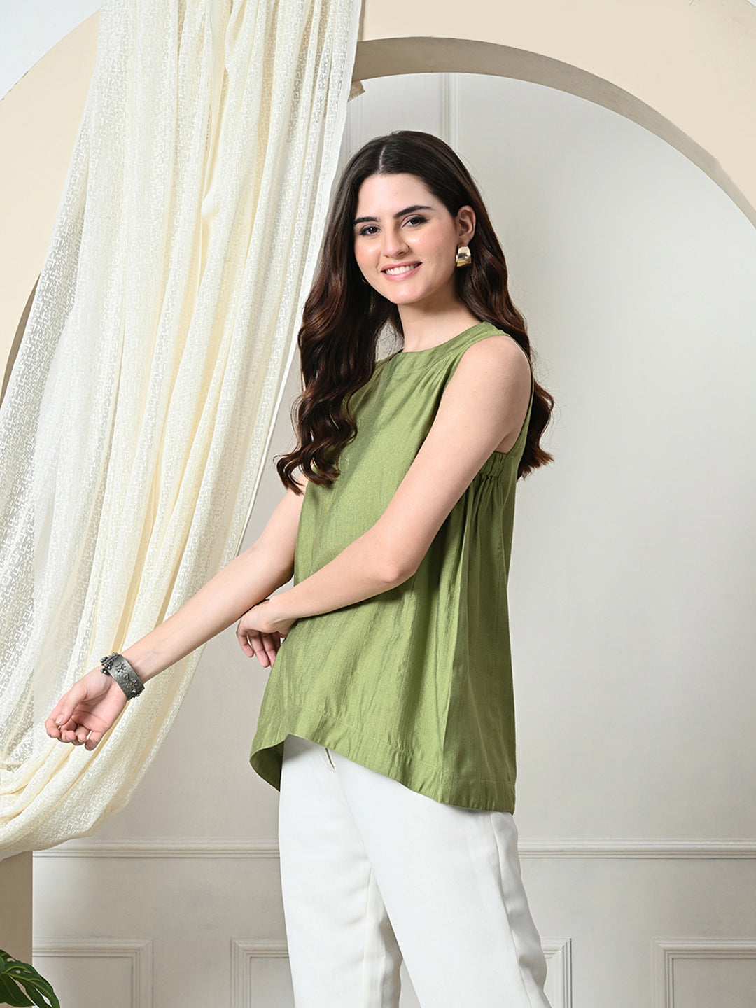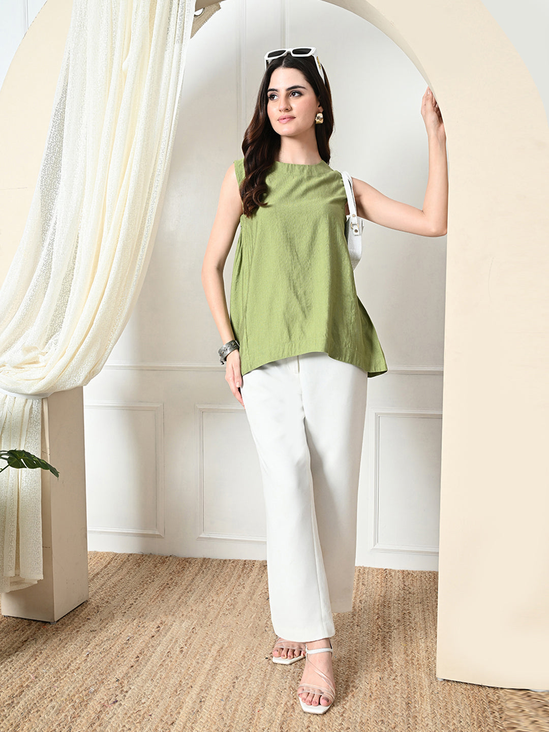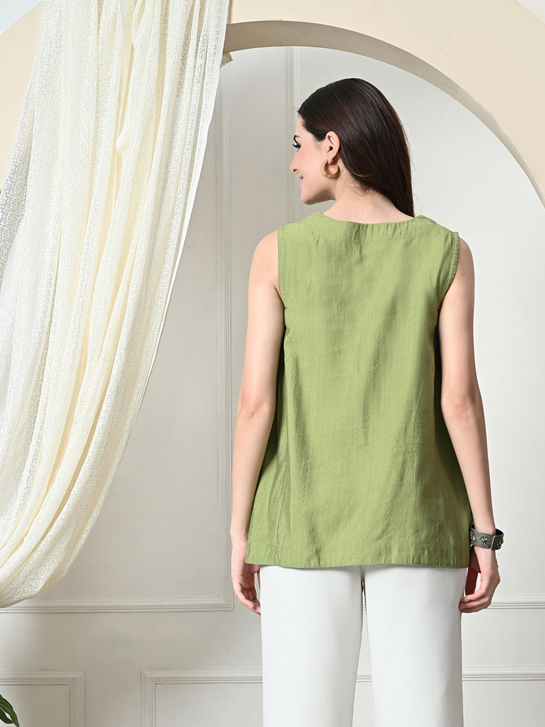 Solid Embellished Sleeveless Round Neck Casual Tops In Green Colour