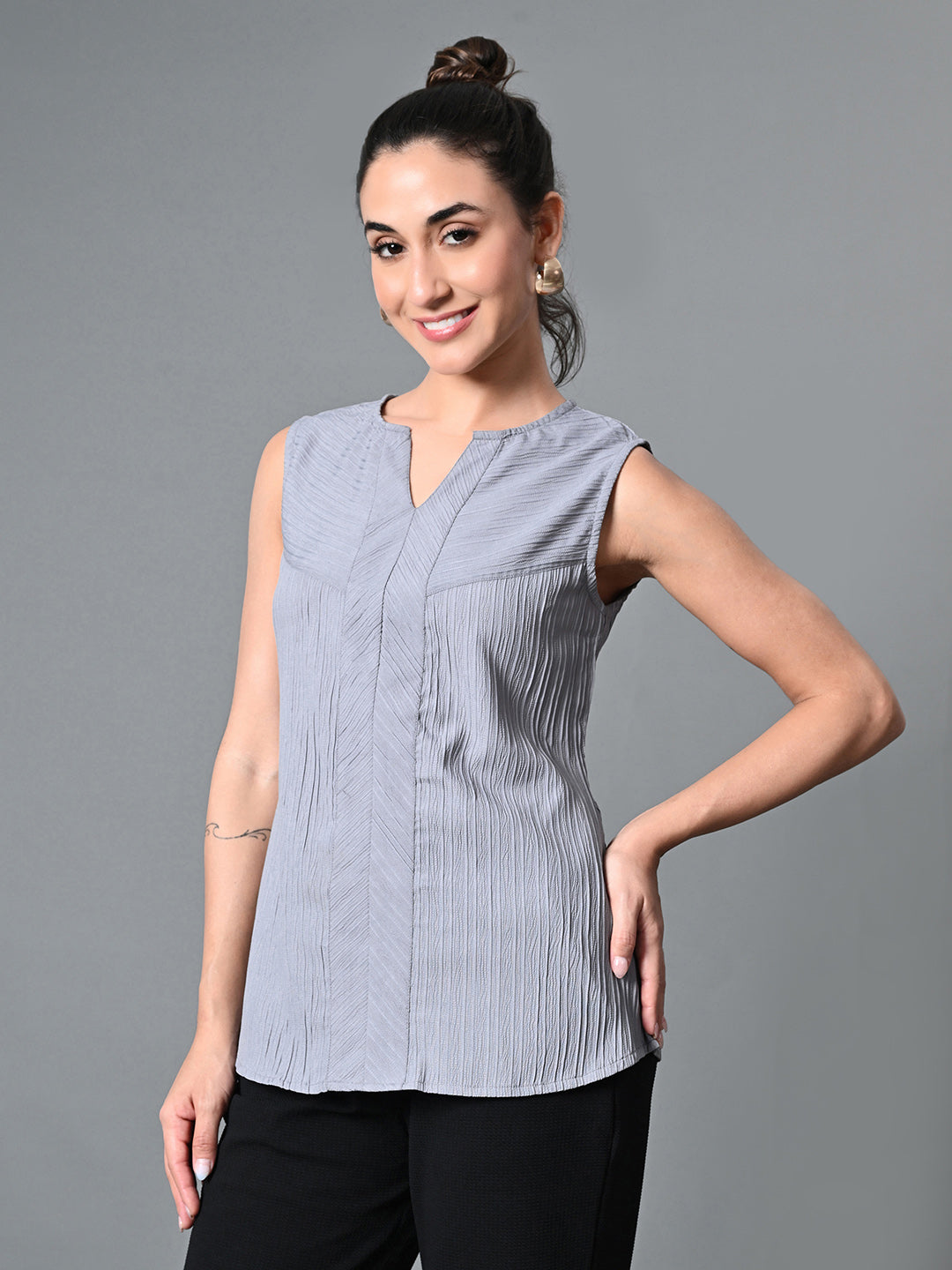 Keyhole Neck Sleeveless Casual Top In Grey Color