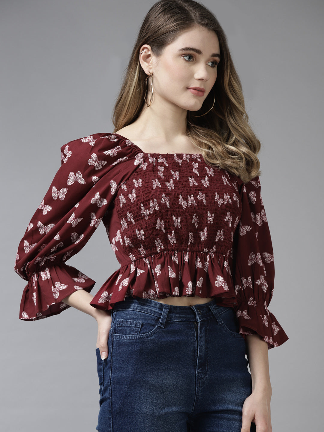 Maroon Printed Off Shoulder Top, Has A All Over Elastic On Shoulder, Long Sleeve, Straight Crop Top