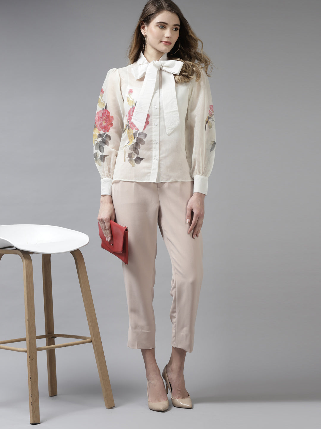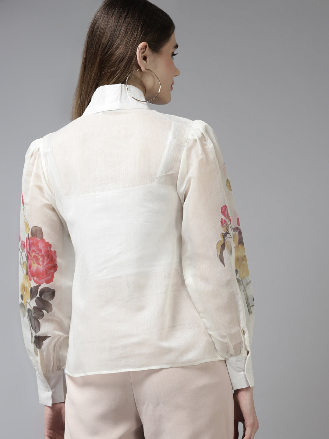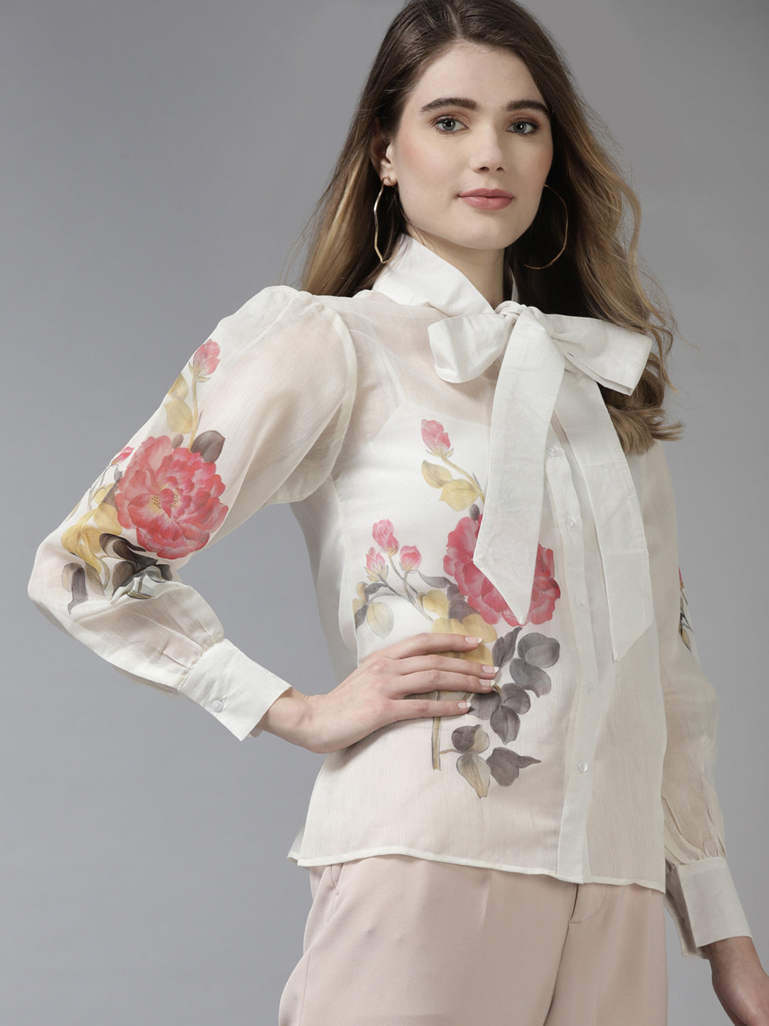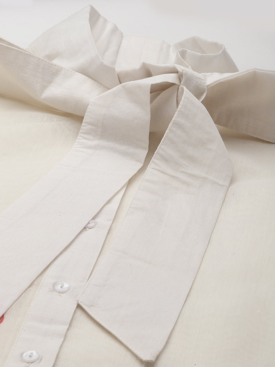 Off White Shirt, Big Printed Motif On Sleeve, Has A Long Sleeve, Tie Up Style Collar
