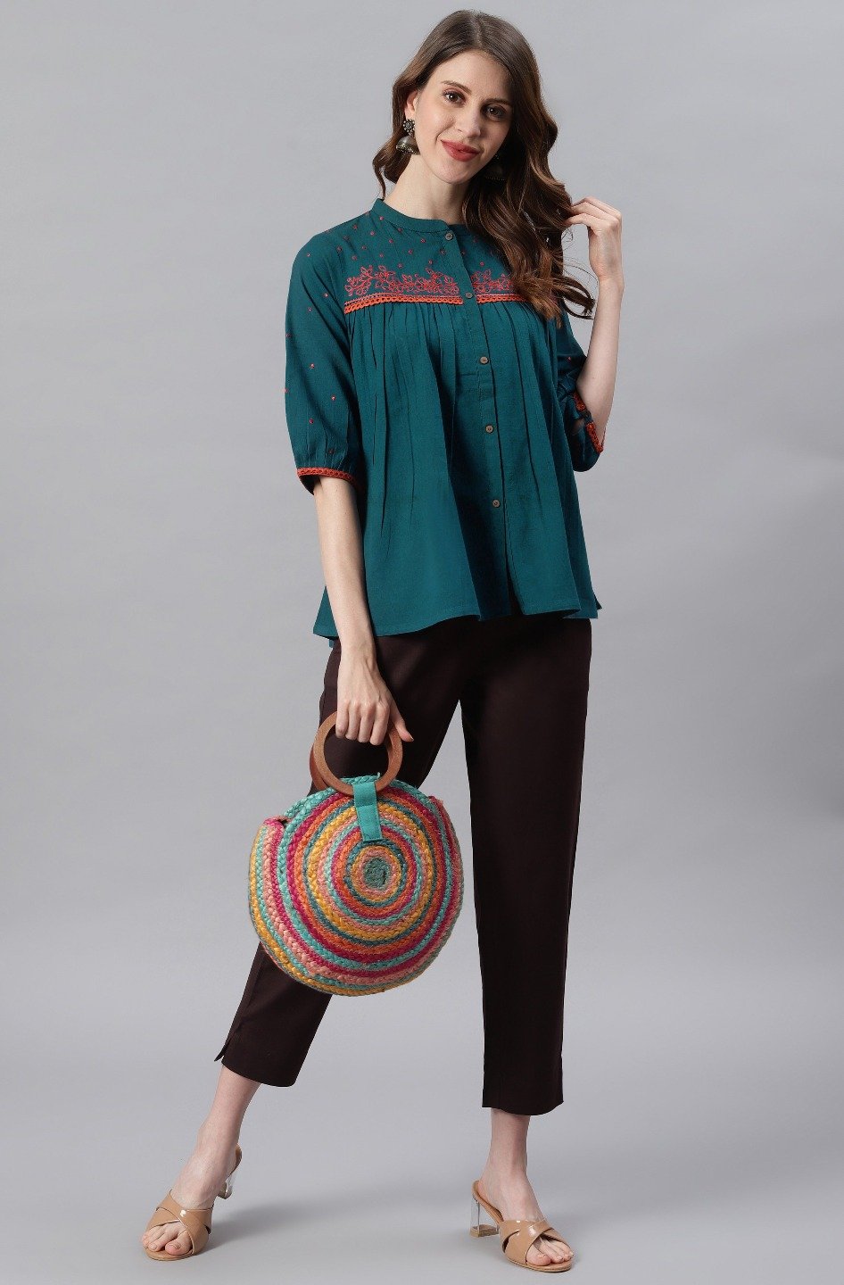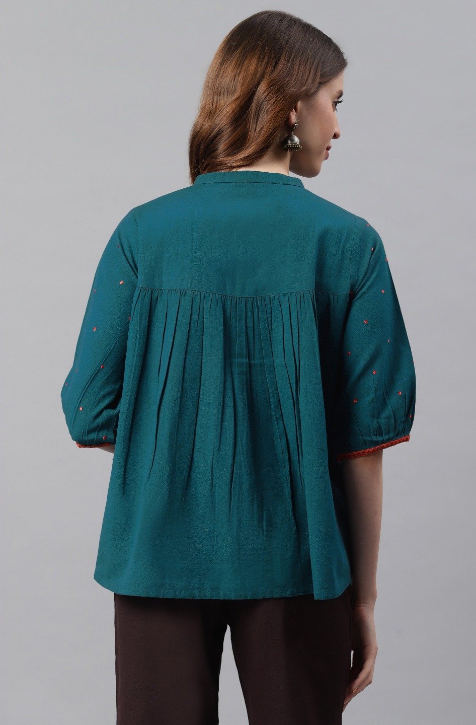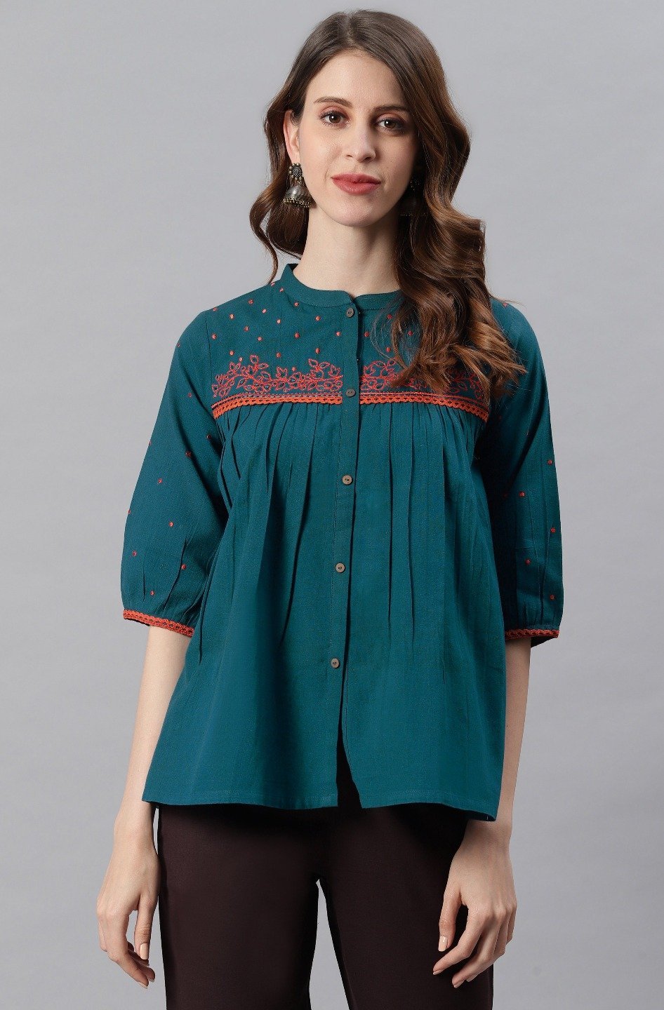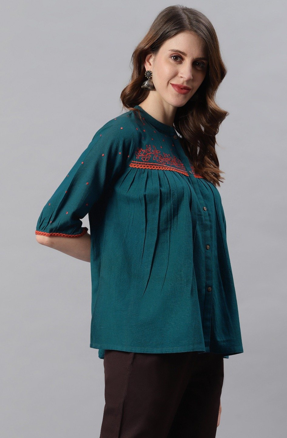 Trendia brings you this Teal Cotton Flex Top for women by the brand Mansa. This cotton top for women is teal in colour with a minimal embroidered pattern around the neck and has waist length. The teal colour tops for women has a subtle pattern. The neck is a trendy chinese neck and looks subtle along with 3/4th puff sleeves. The beautiful top for women is in cotton flex fabric and looks fabulous with pants or palazzo. Check out photos of the top or a more detailed look.