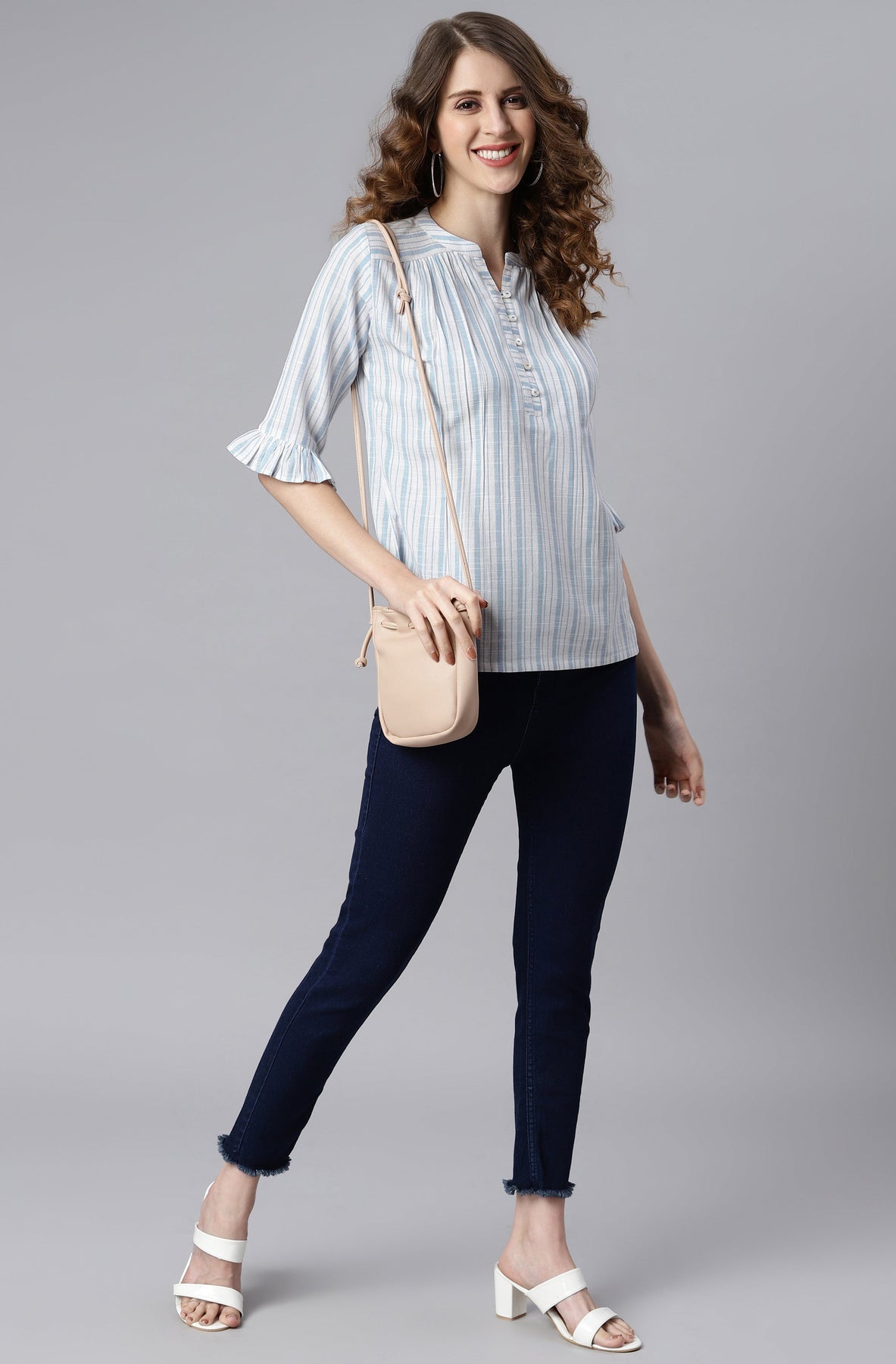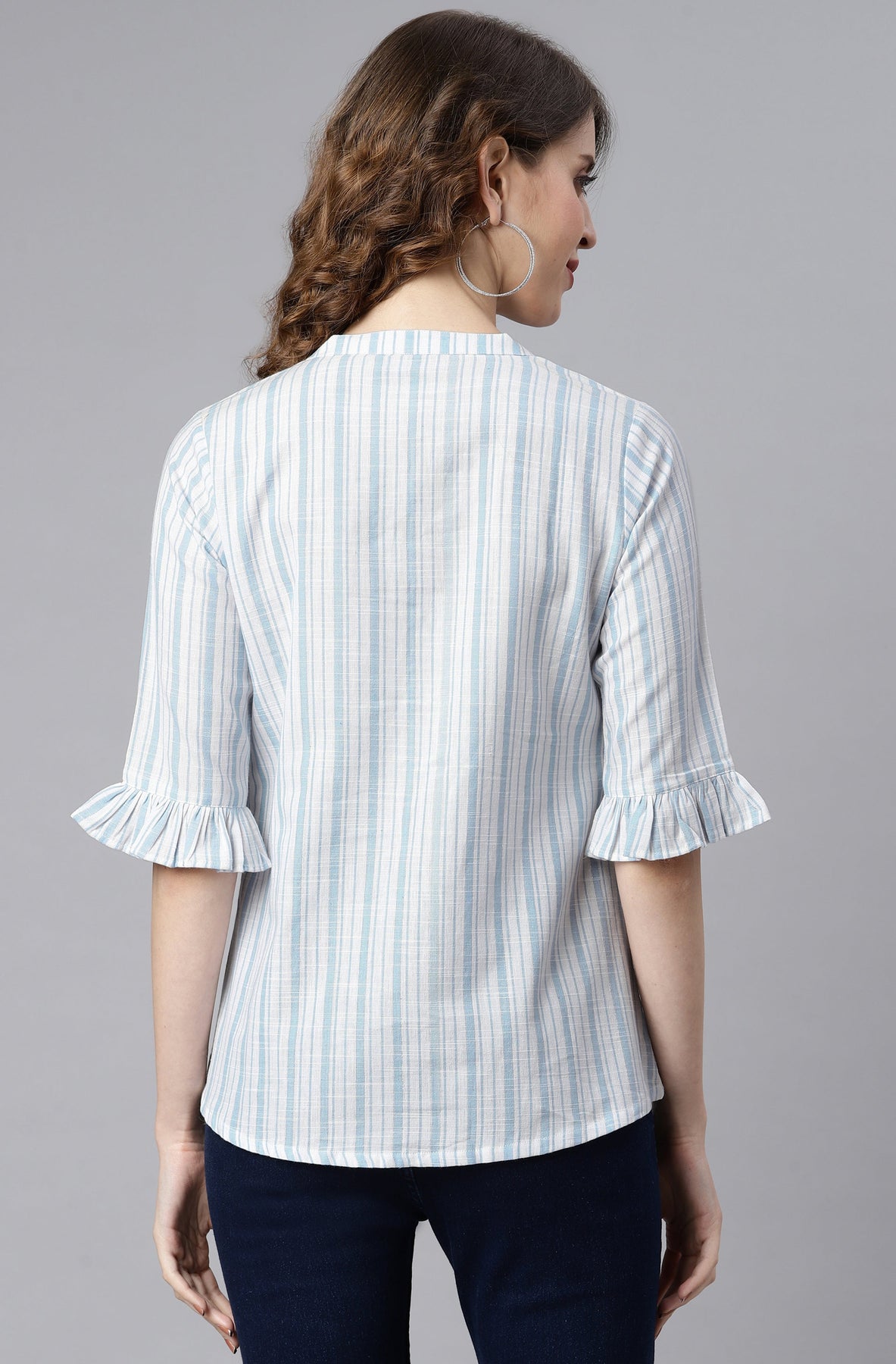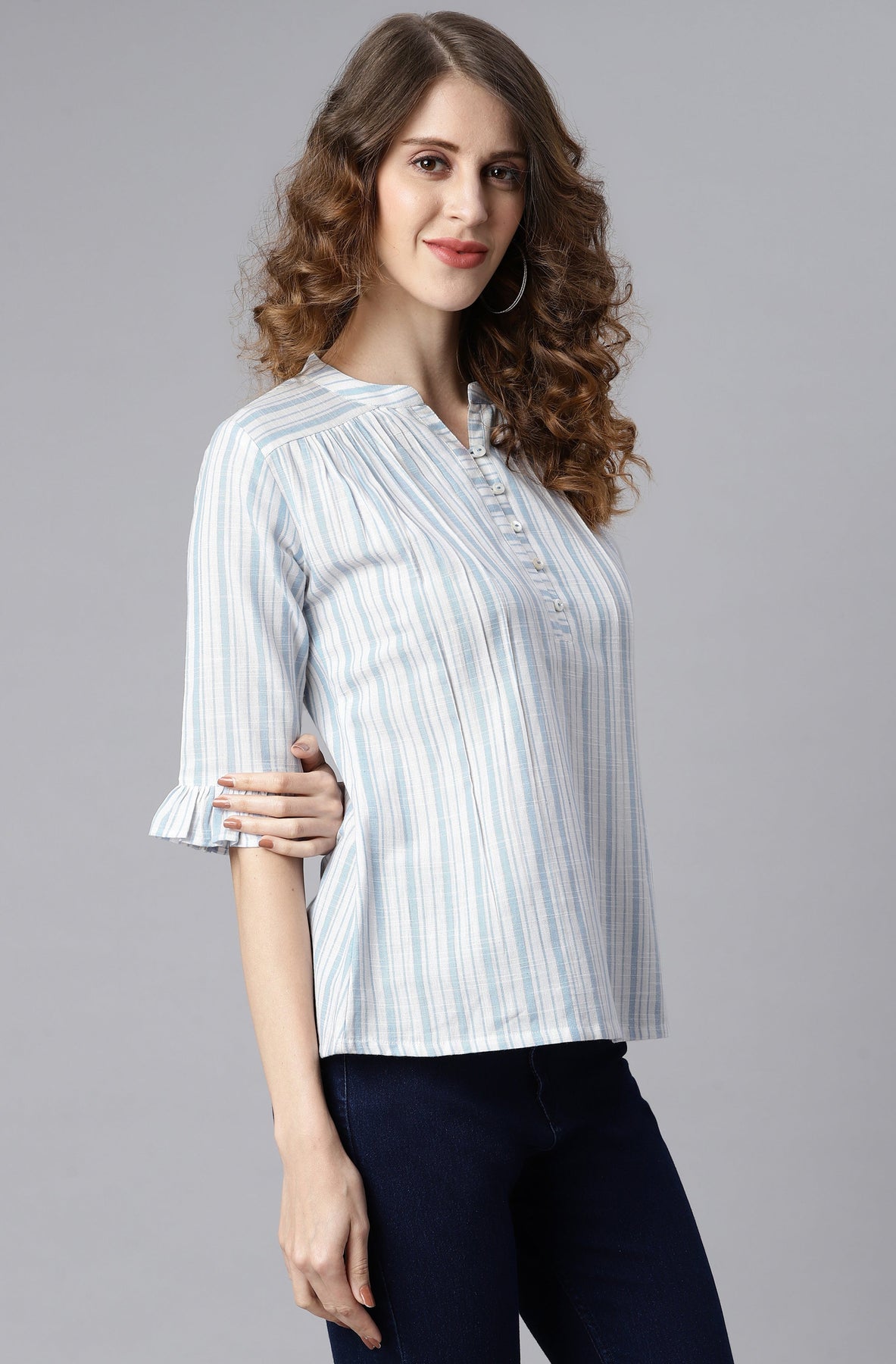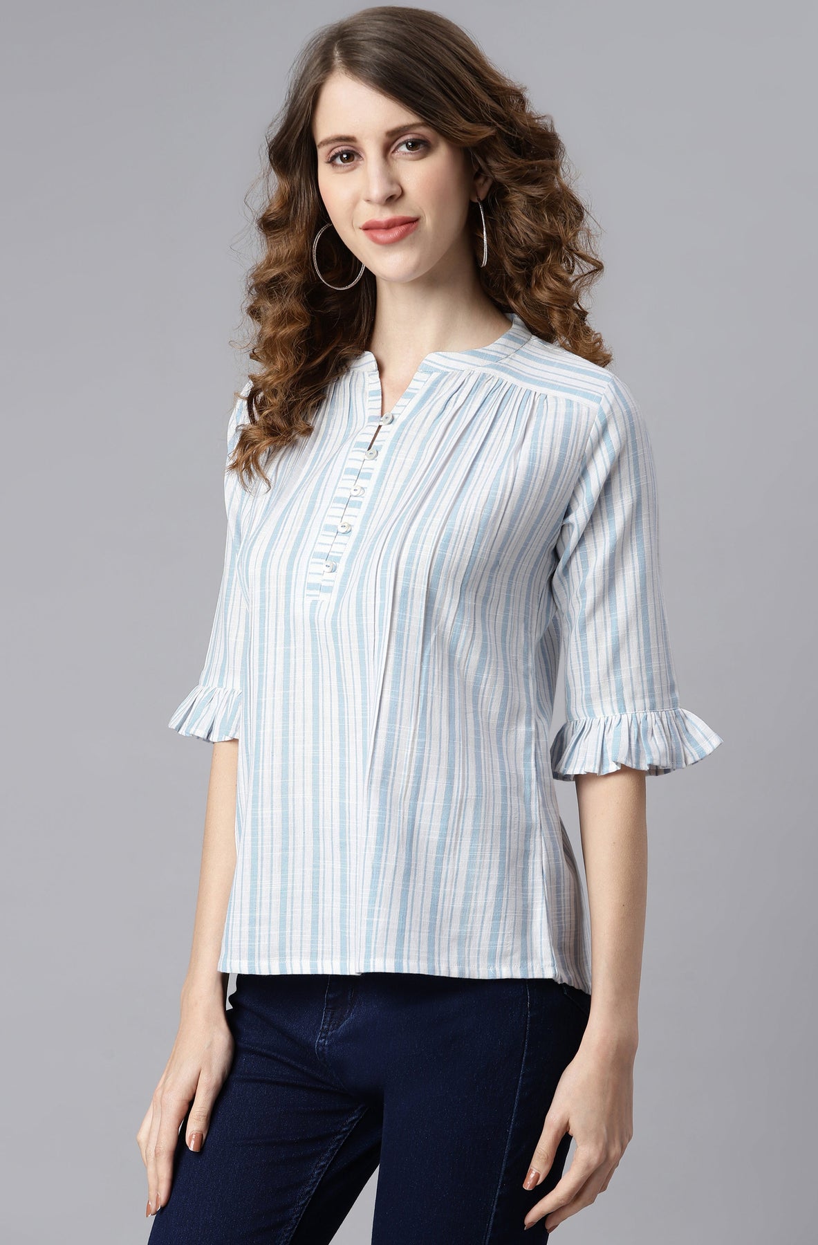Premium Collection by Janasya. Enliven your everyday style by choosing this white and blue top from Janasya. Rendered from premium quality cotton this top has gather detailing on front with frills on sleeves hem. This top has button and loop detailing on yoke adding a touch of glamour in it. Team it up with denims and studded earrings for contemporary charm.