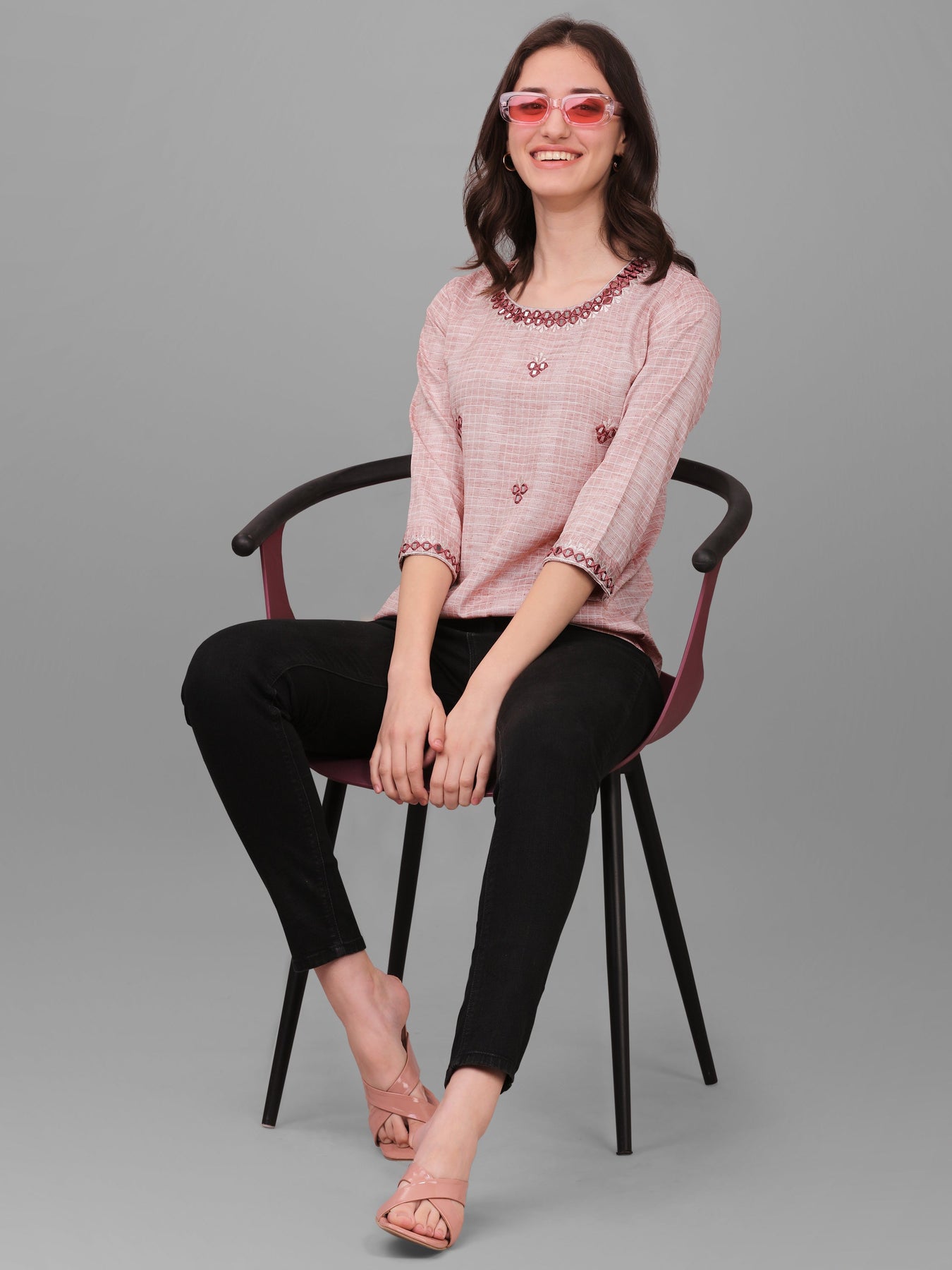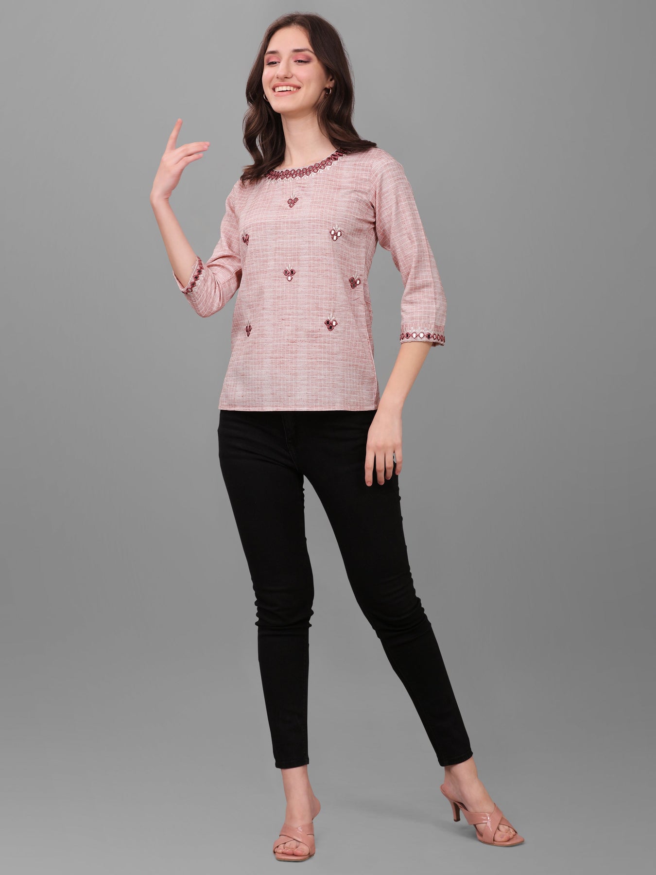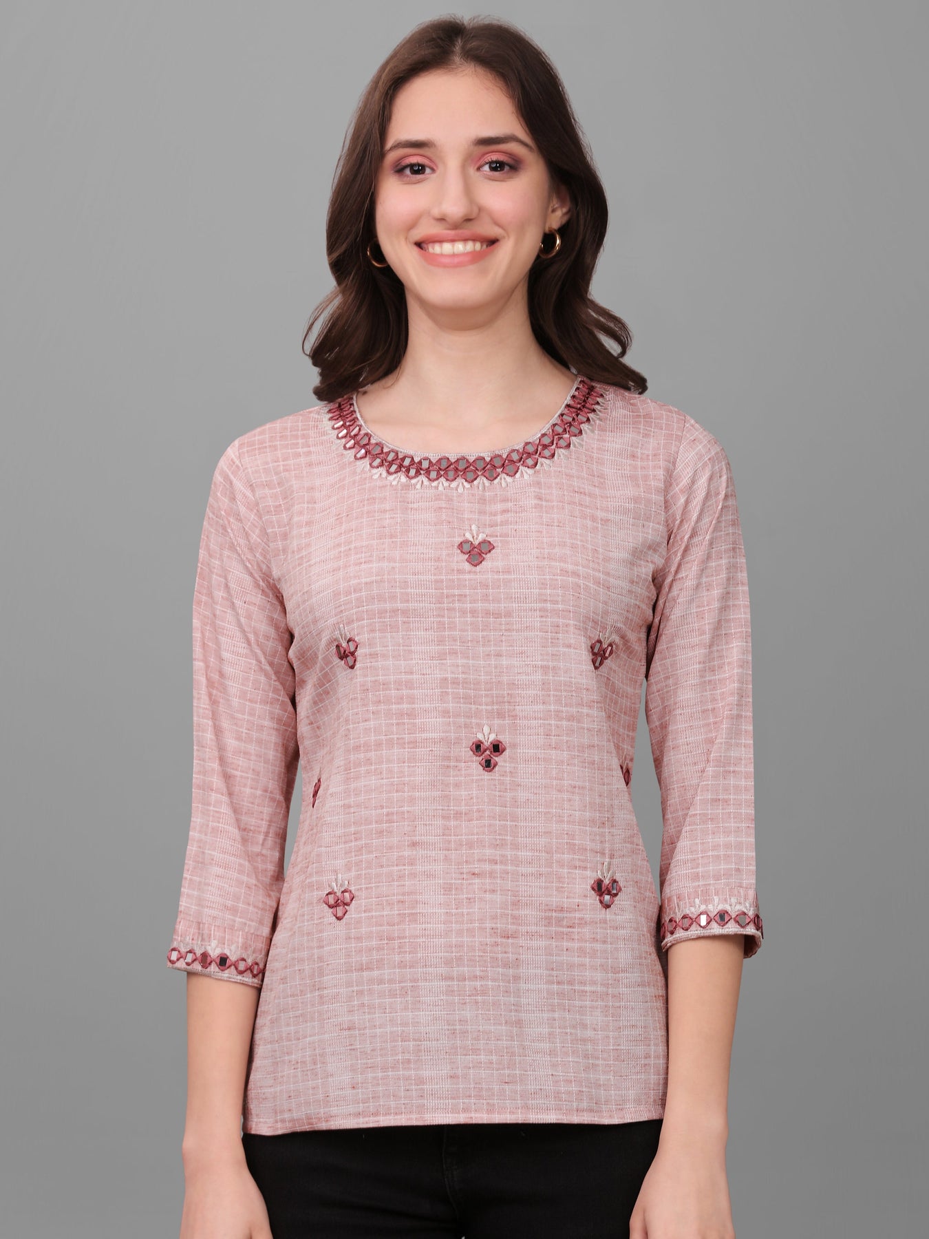 Women's Waist Length 3/4 Sleeves Casual Mirror Work Top (Pink)