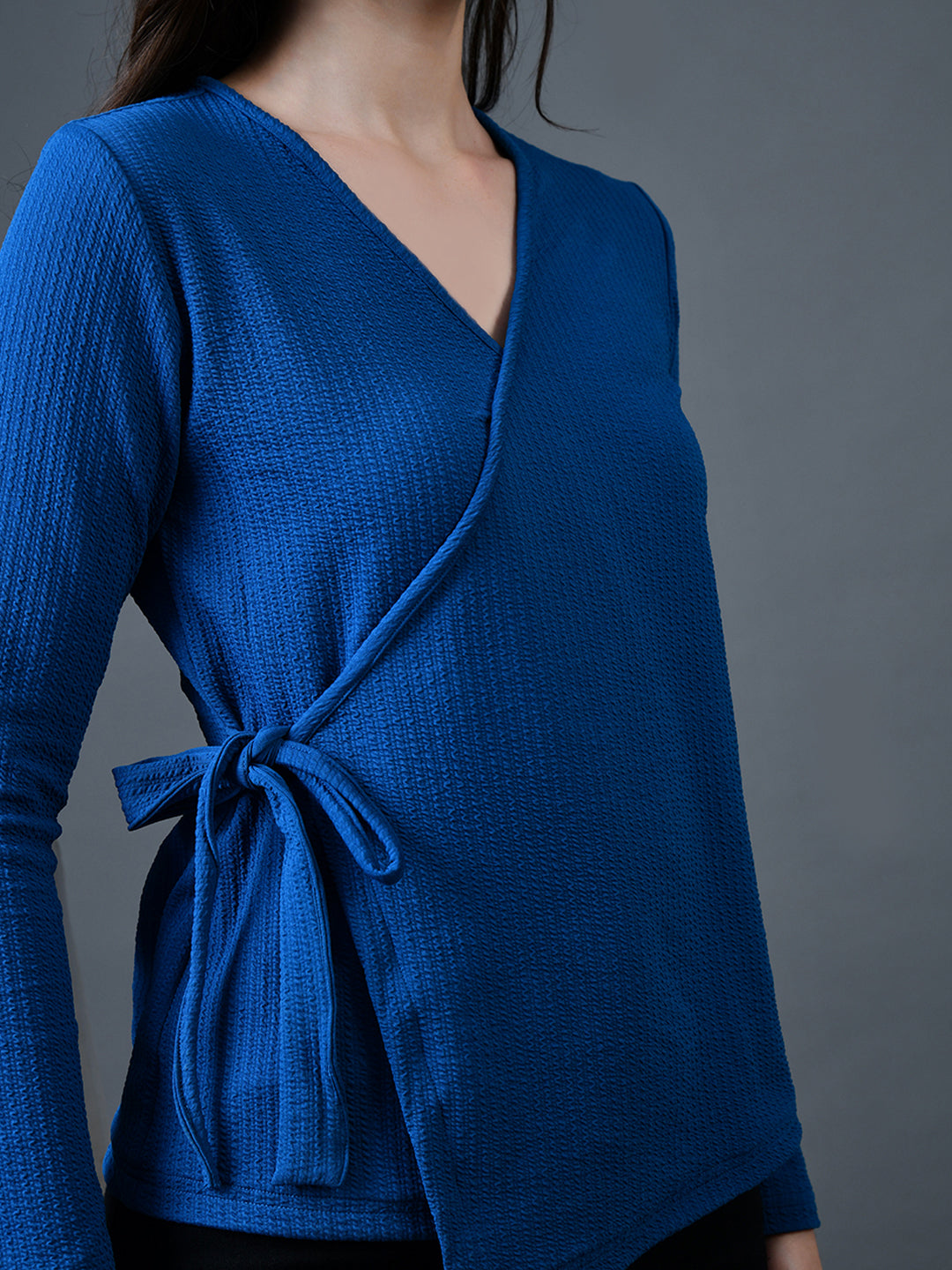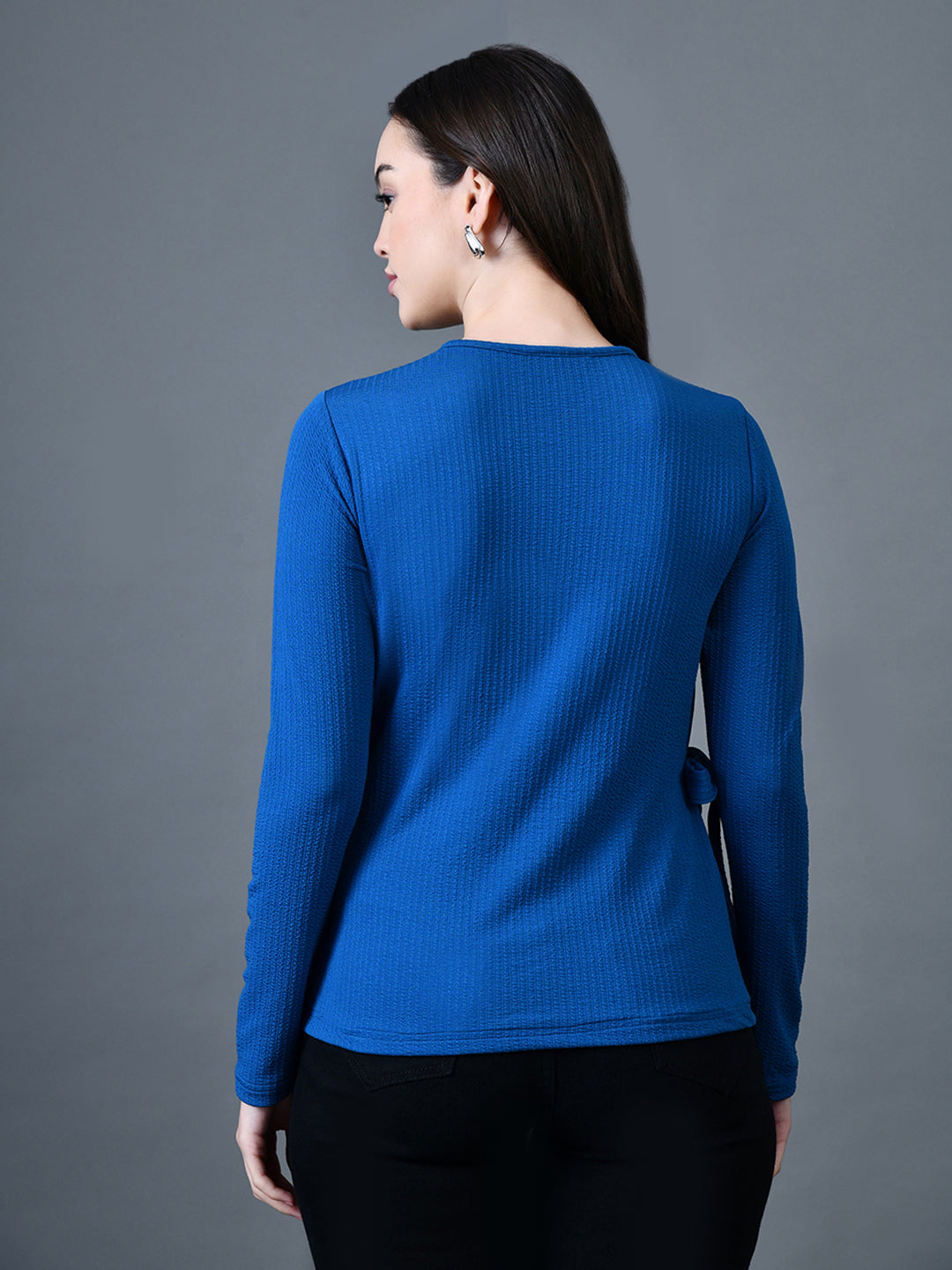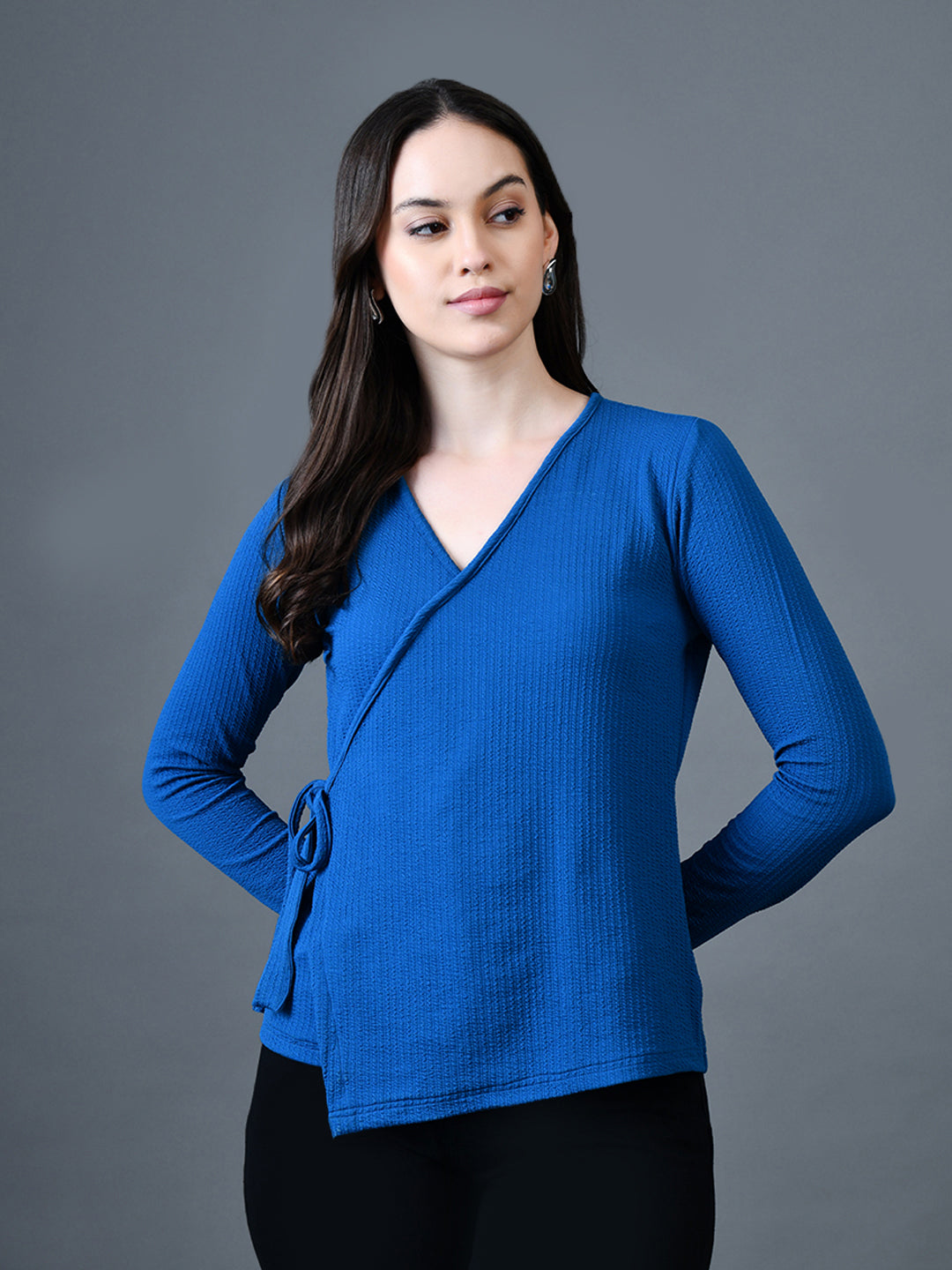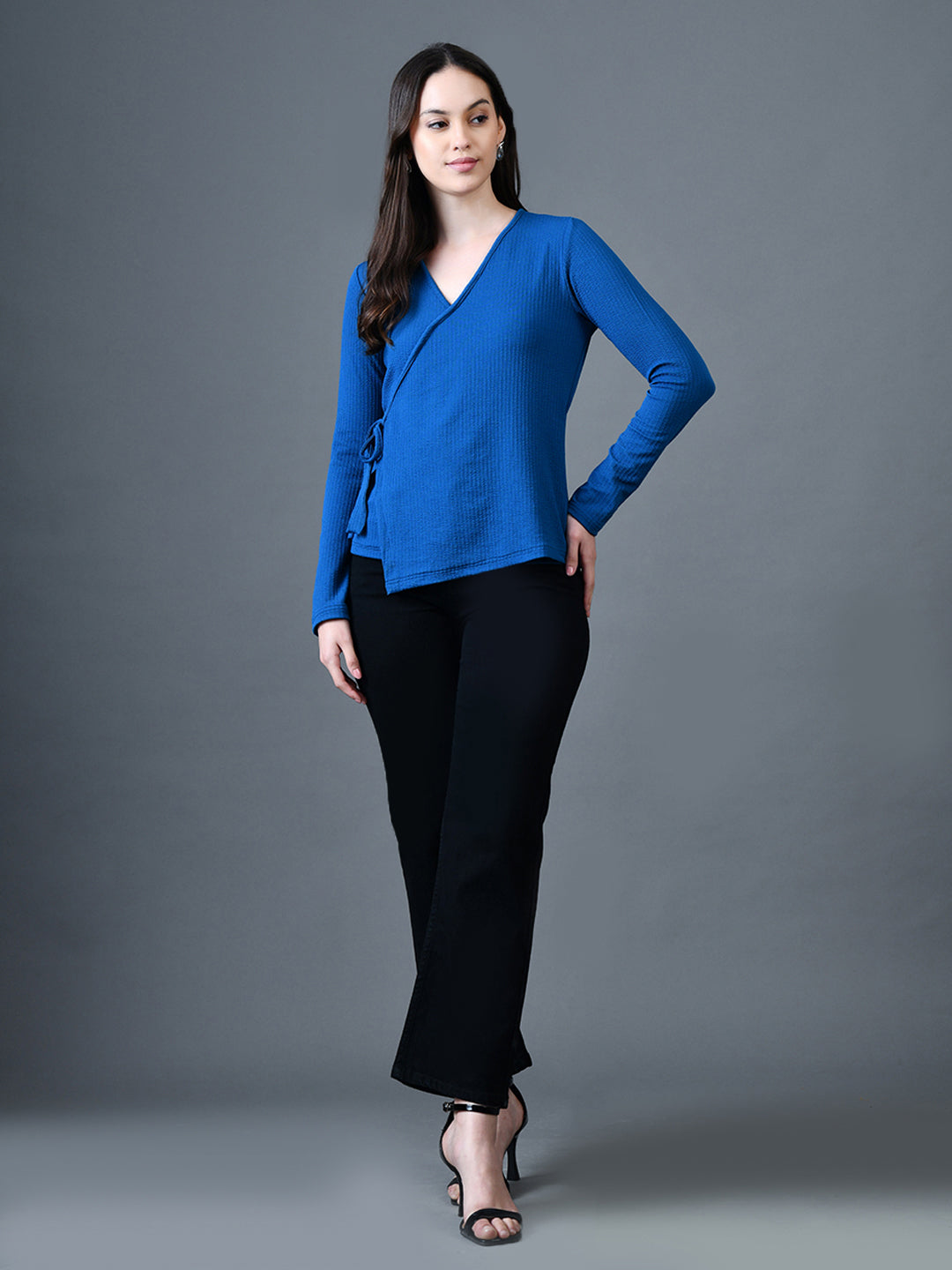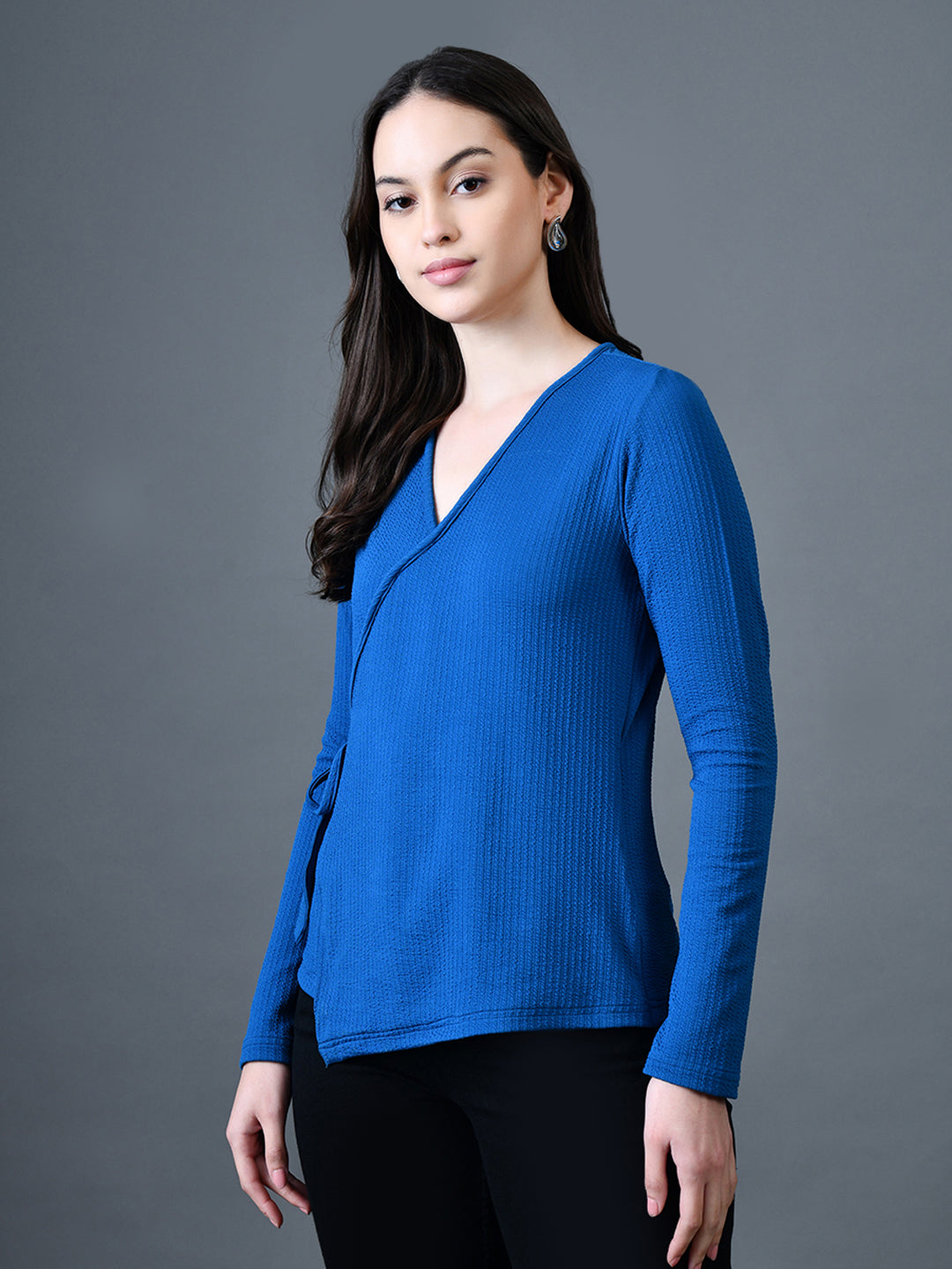 Myshka Women Blue Polyester V-Neck Long Sleeves Solid Tops