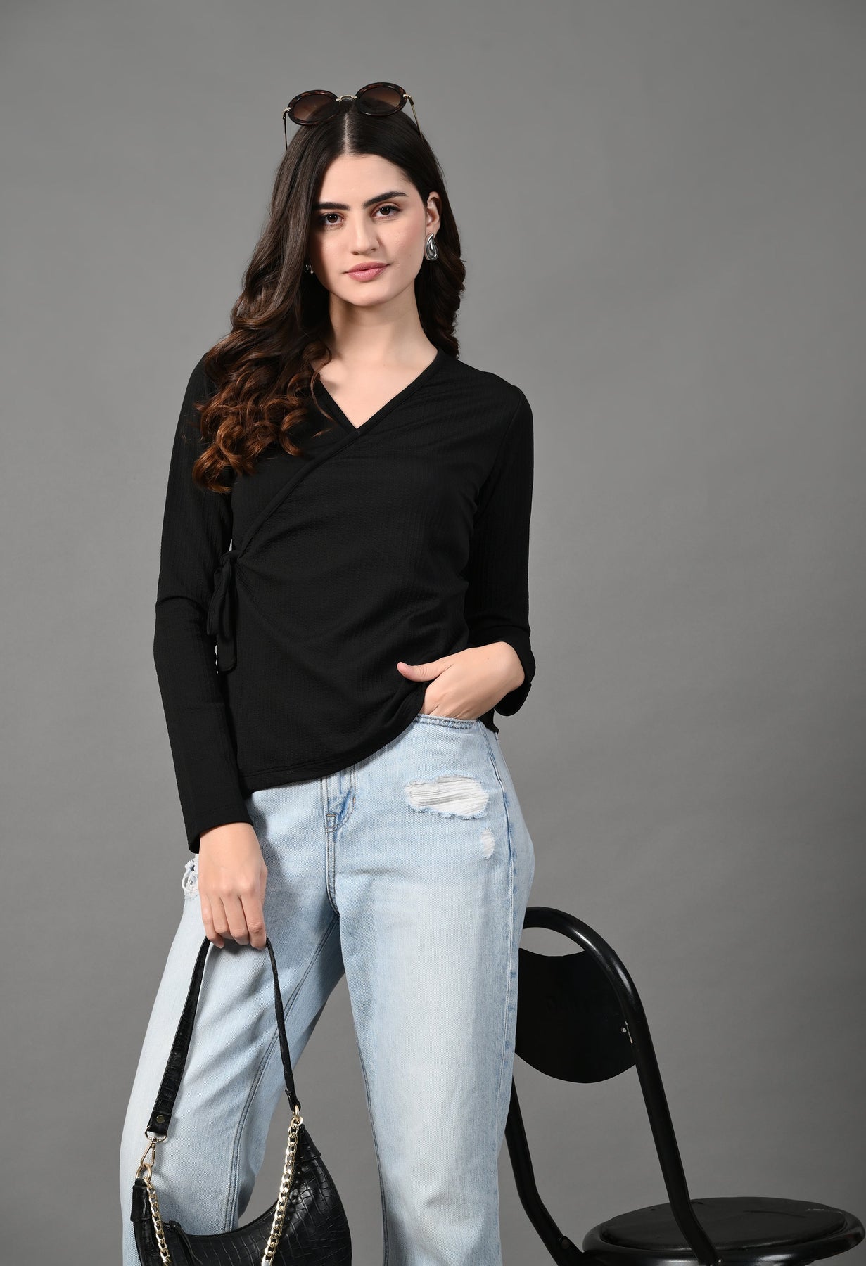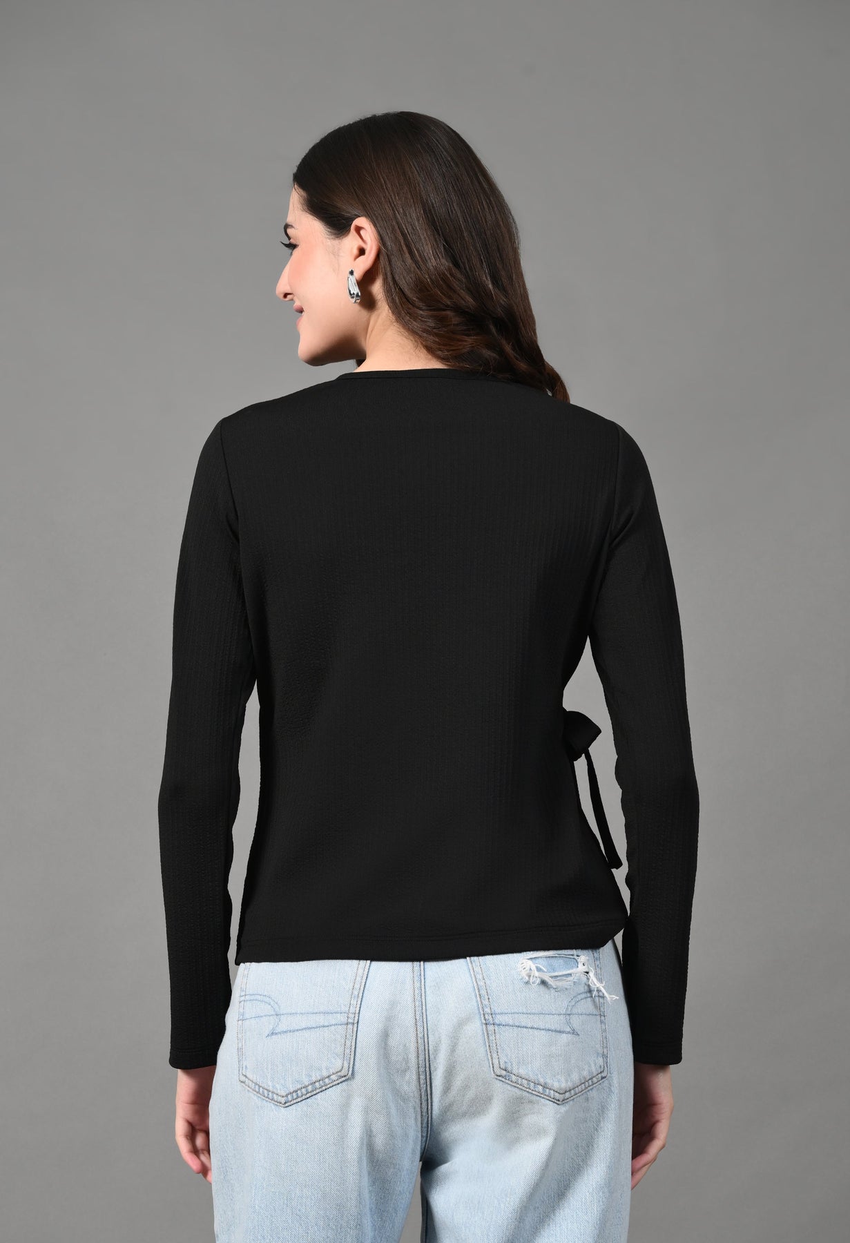 Myshka Women Black Polyester V-Neck Long Sleeves Solid Tops