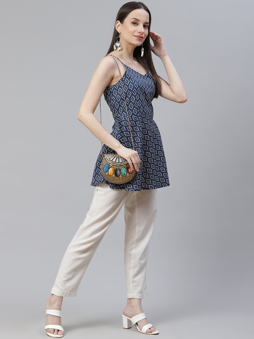 | Wave Of The Summer Heat With Very Stylish, Blue Geometric Printed Shoulder Strip Top. Its Dressy Summery And Very Chic, You Can Team It Up Jacket Or Even Wear It On A Casual Evening Out, A Day Night, Or Partying With Friend. Team It Up With Minimal Accessory For Perfect Styling. |