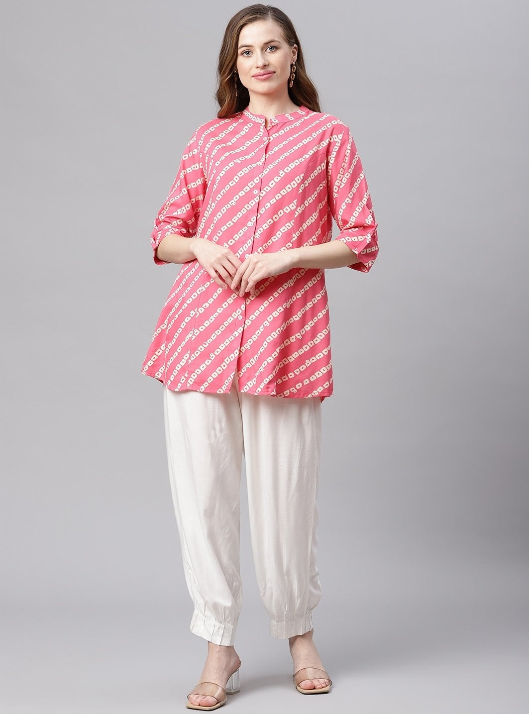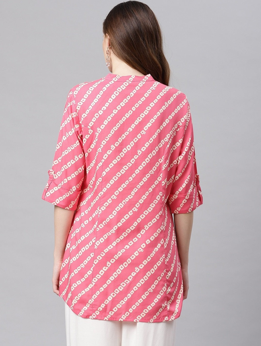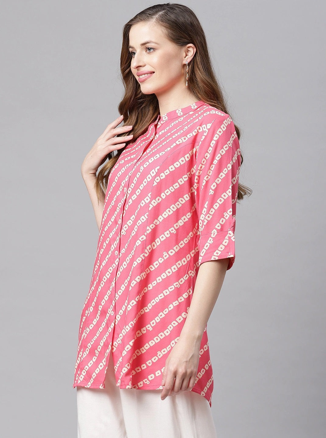 Very Elegant And Stylish Range From The Noz2Toz Tops, Made Up Of Rayon Fabric With Bandhani Print Looks Gorgeous Makes It Comfortable And Wearable For Office Purpose Or Any Casual Outing, It Has Apple Bottom Cut And Shirt Button Up Pattern With Semi Collard Neck And Rollup Sleeves. Pair It Up With Your Favorite Denim Or White Pant For Stunning Look.