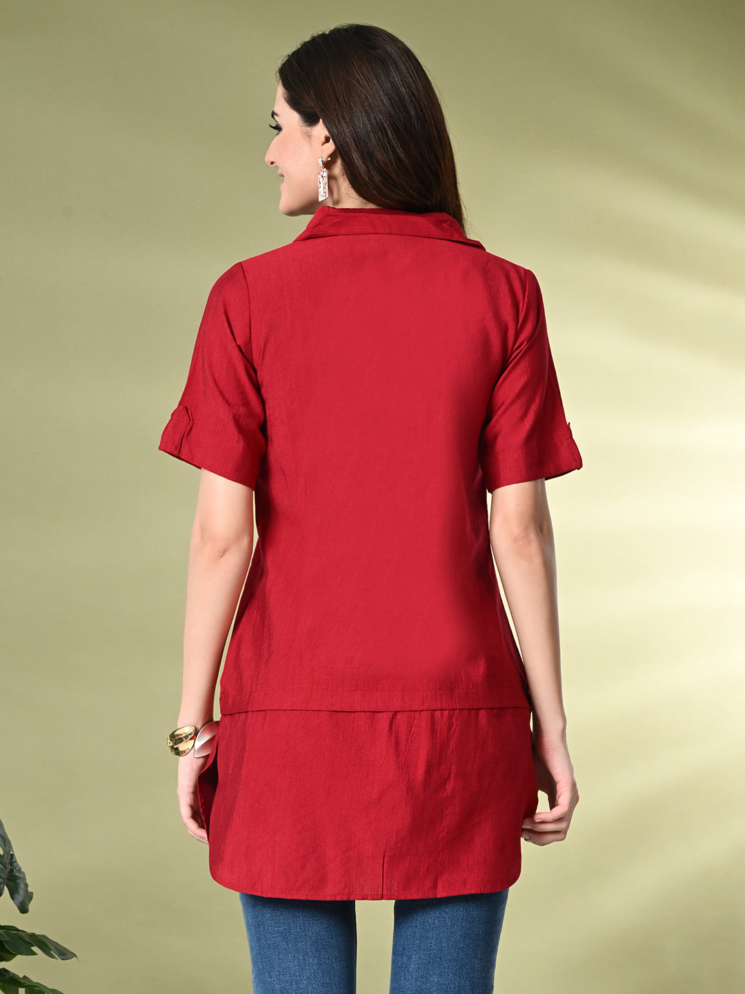 Solid A-Line Collared Neck Casual Tunic In Red Colour