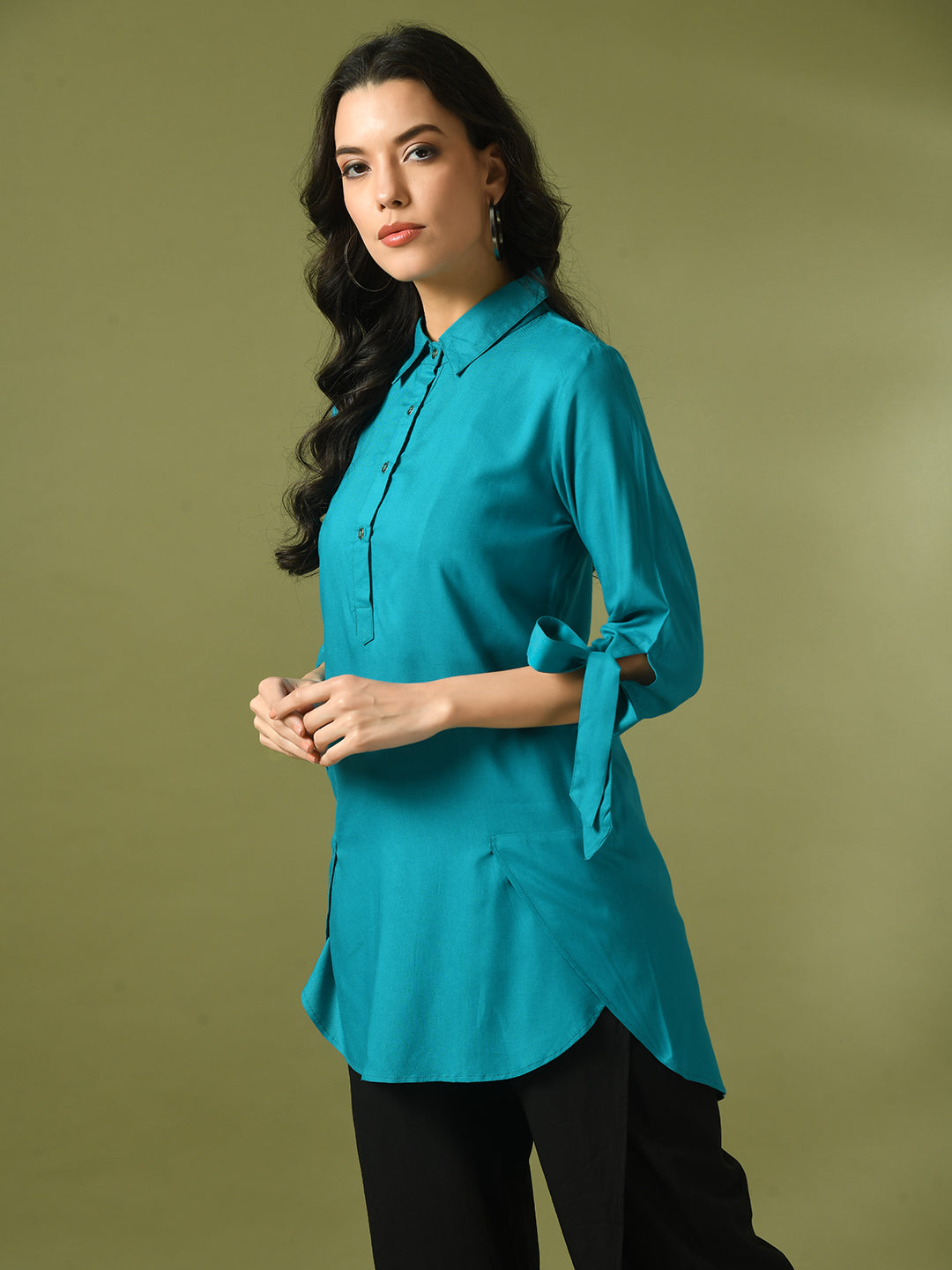 Women Turquoise Blue Solid Cotton Longline Party Sheer Tunic