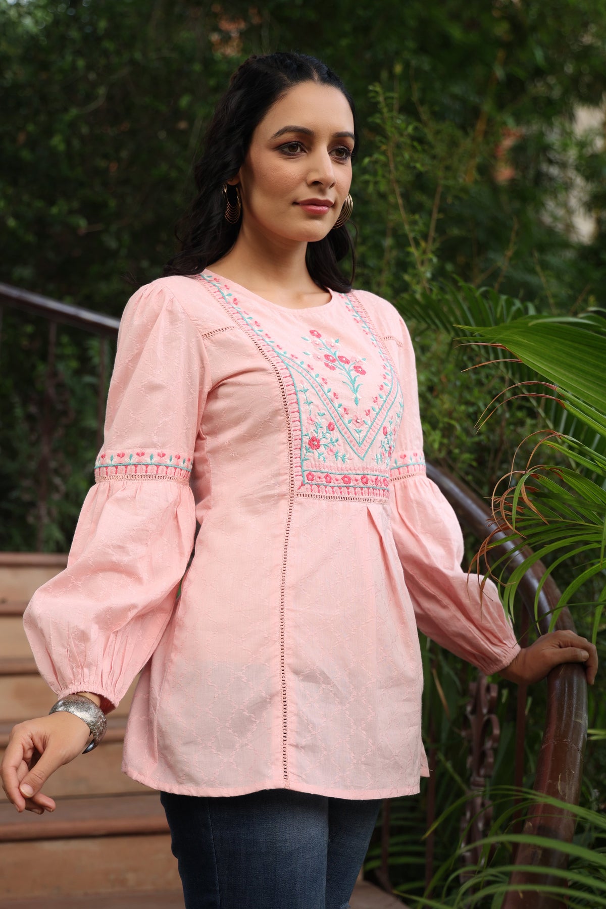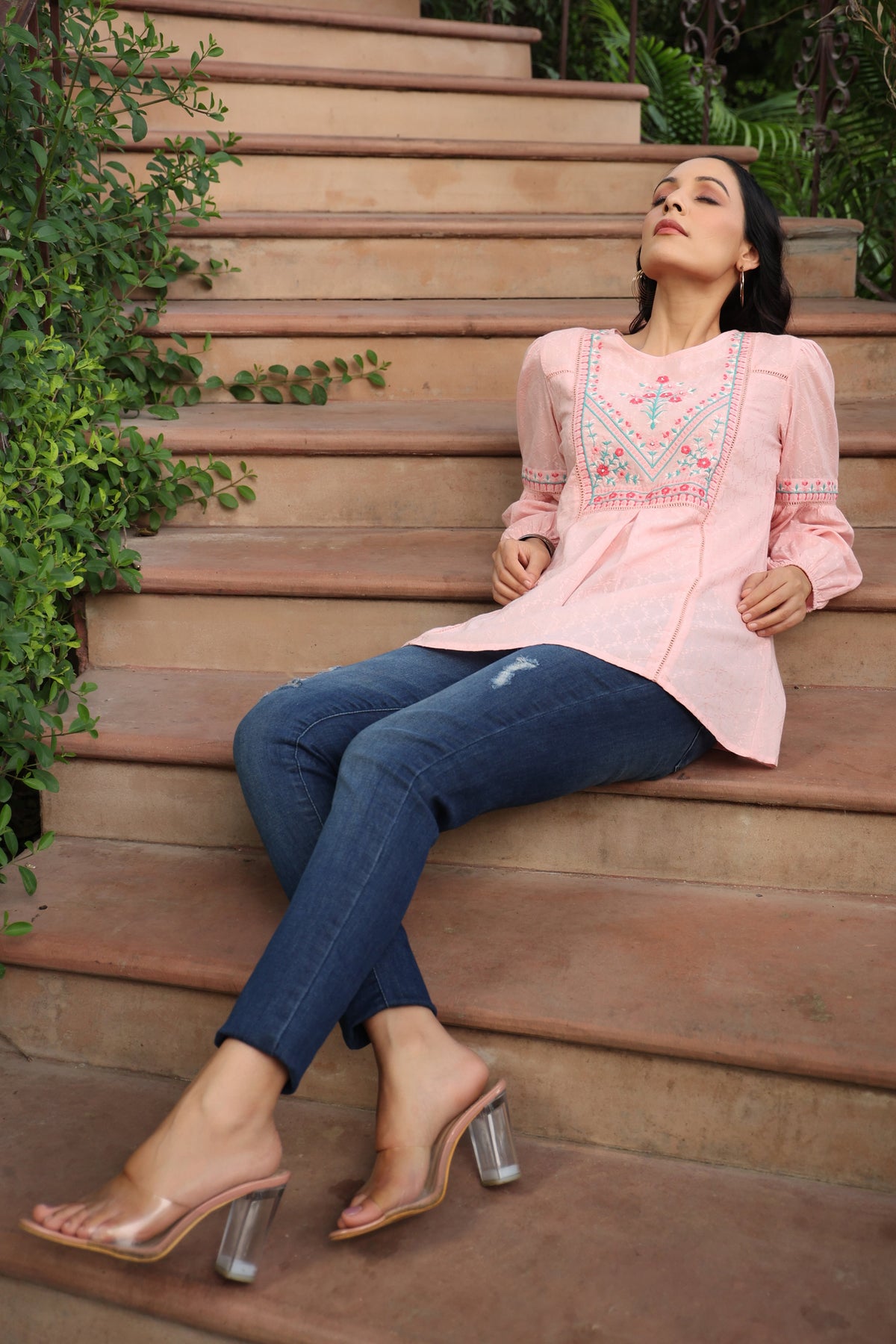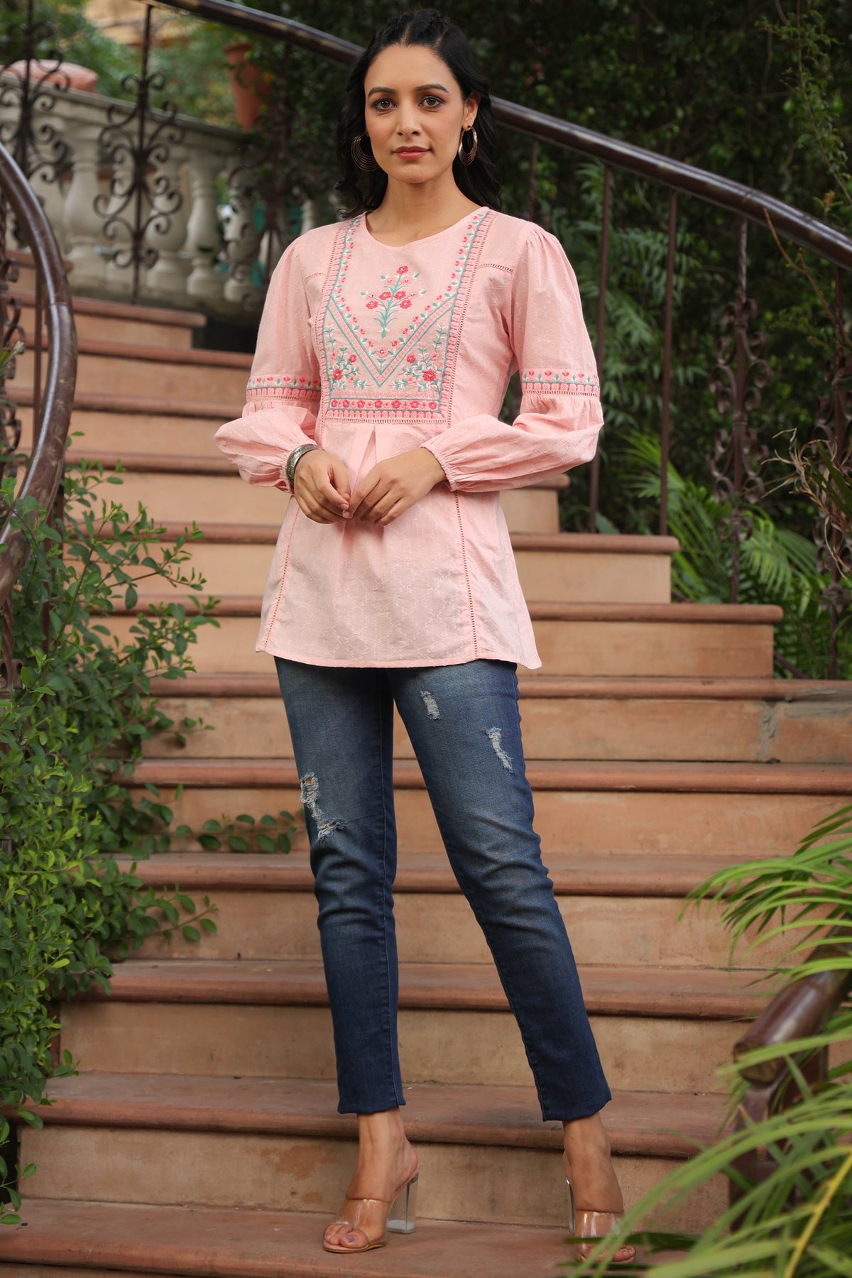 Juniper Women's Peach Cotton Dobby Solid Embroidered Straight Tunic Length :Regular Shape :Flare fit Fabric :Cotton Dobby Color :Peach Pattern :Embroidery Neck Line :Round Neck Wash Care :Hand Wash Weight(G) :300