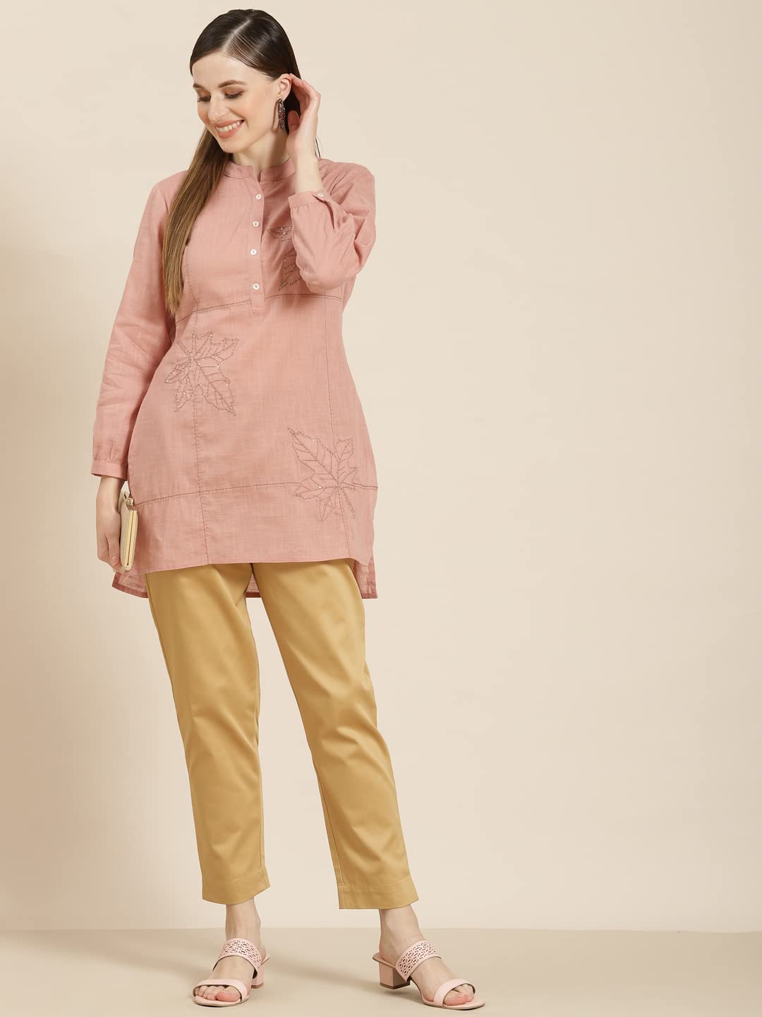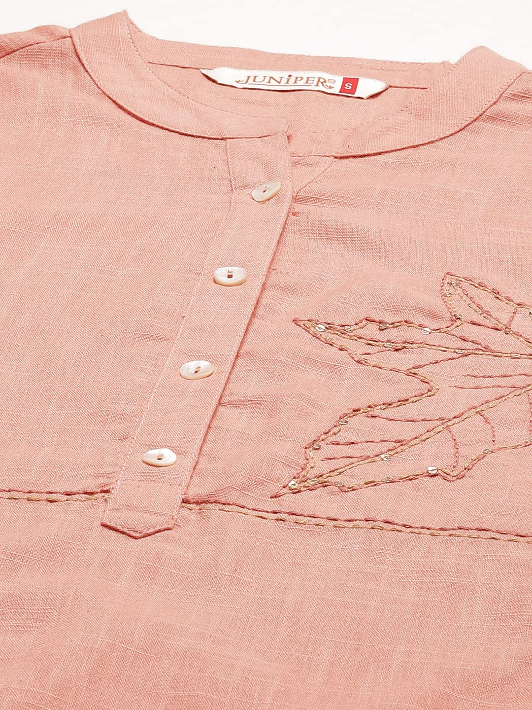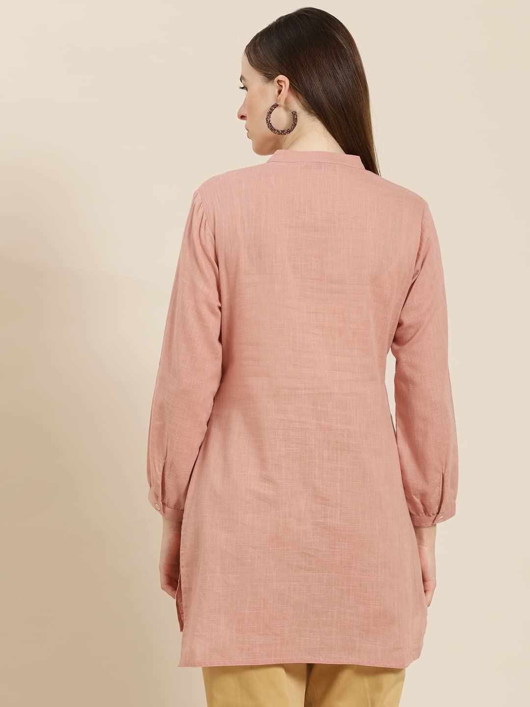 Peach Cotton Slub High Low Tunic With Thread Embroidery. Features A Mandarin Collar, Long Cuff Sleeves & Side Slit. Ideal For Daily Wear.
