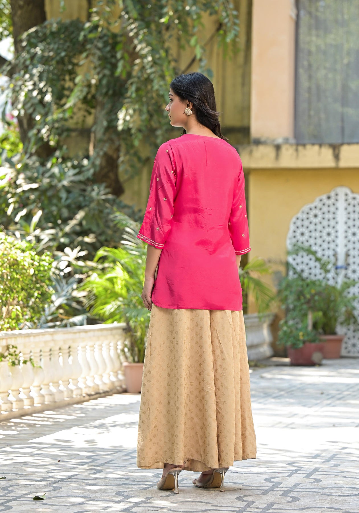 Fuchsia Solid Shantoon Tunic Features Elegant Sequins And Zari Work With Button And Lace Detailing. This Hip-Length Design Has A Straight Hem, Round Neck, And Three-Quarter Regular Sleeves, Offering A Sophisticated, Stylish Look.