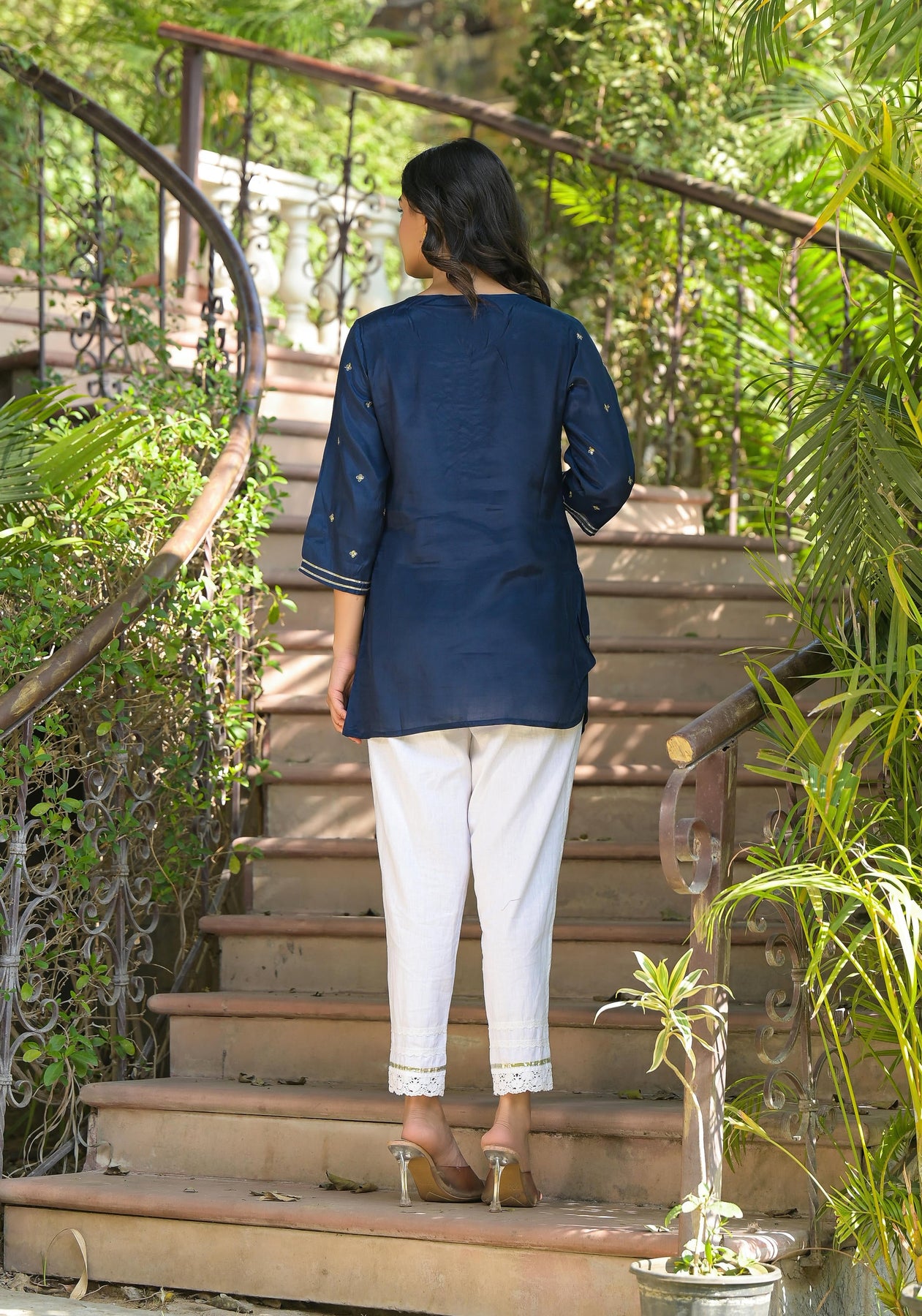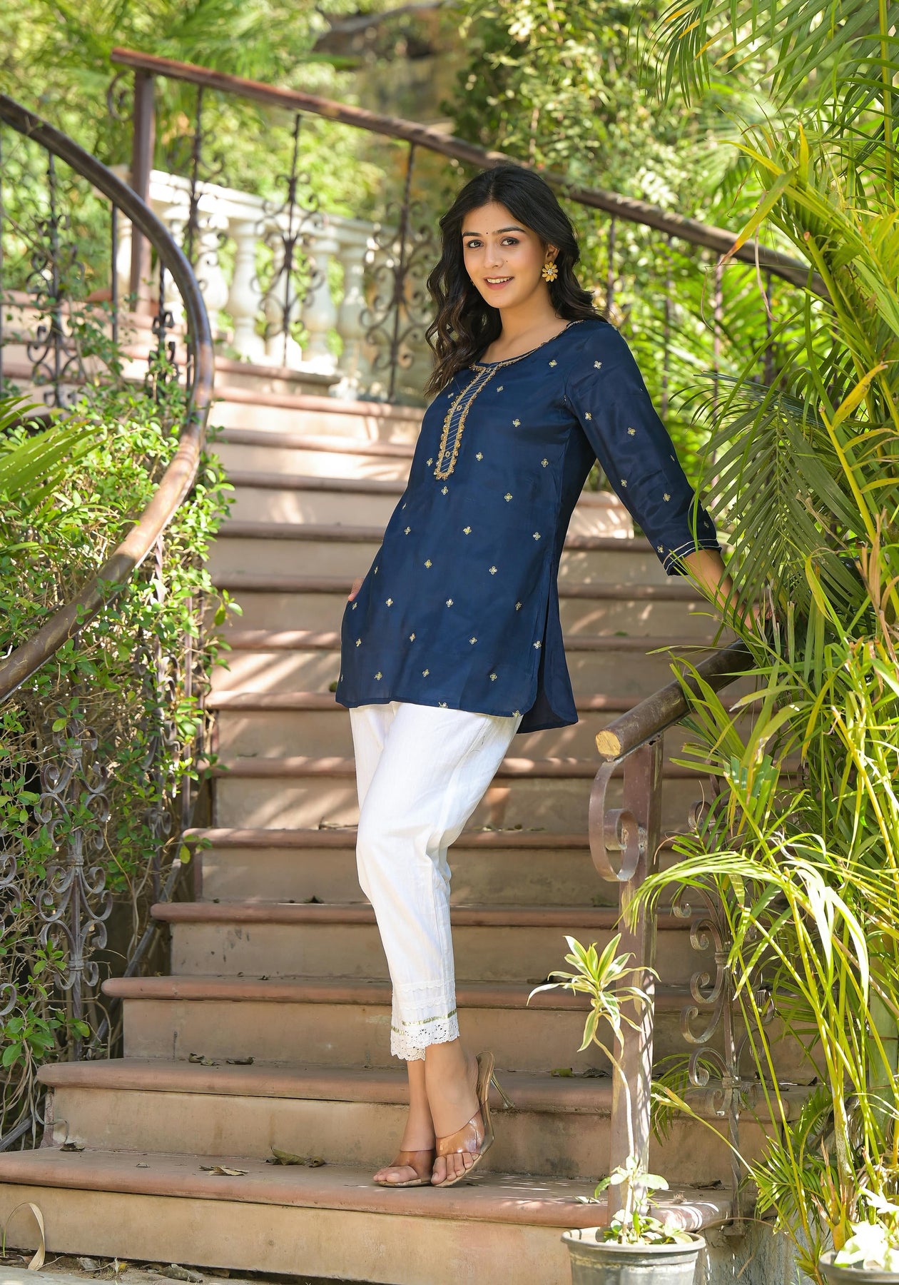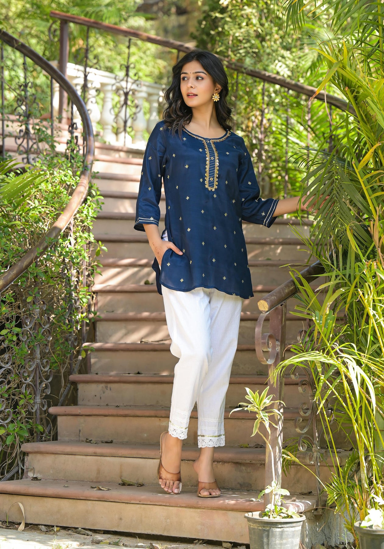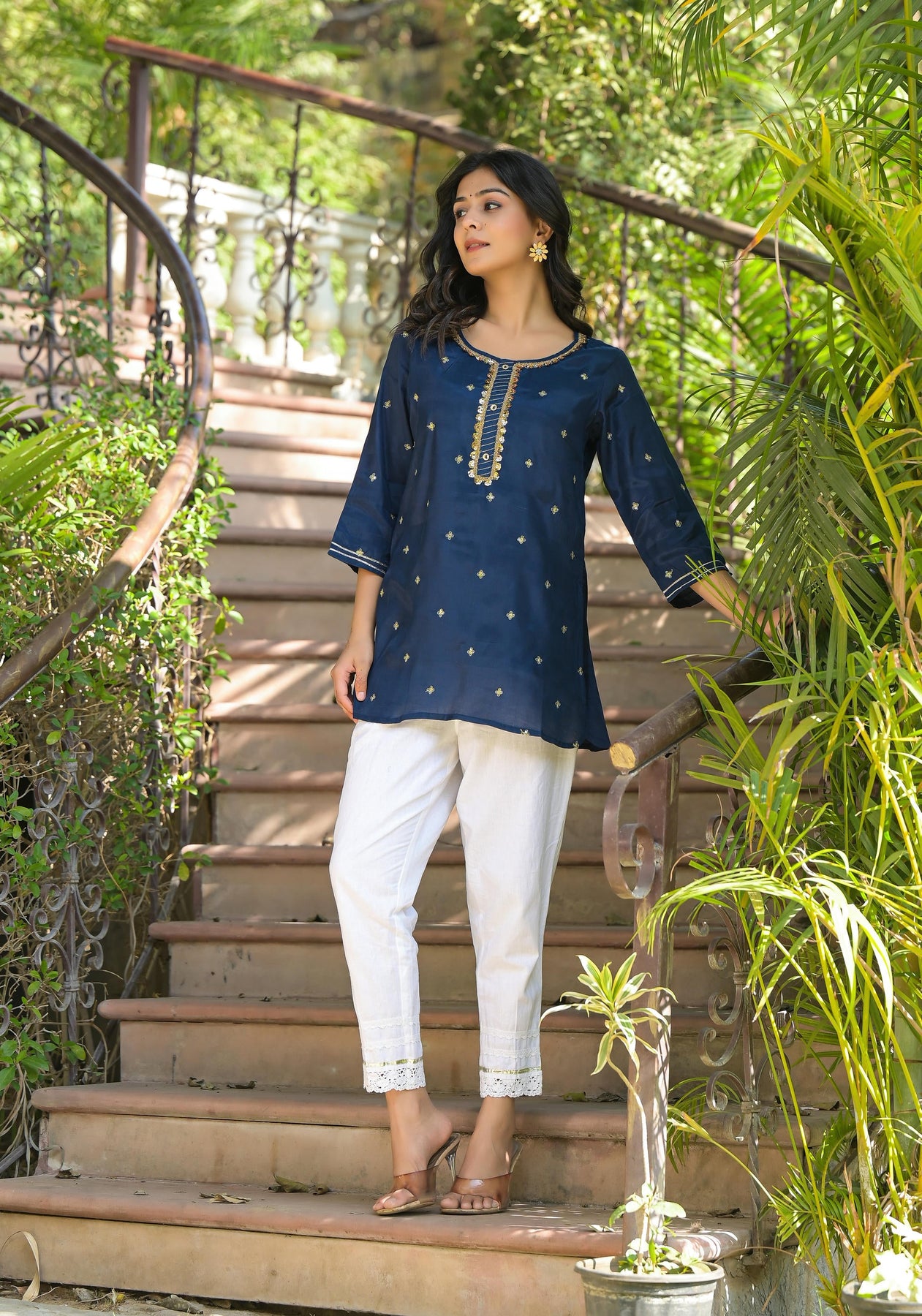 Navy Zari Embroidered Viscose Tunic With Zari Work, Sequins, Lace, And Buttons. This Straight Tunic Features A Round Neck And Three-Quarter Regular Sleeves, Offering A Refined And Elegant Look With Intricate Detailing.