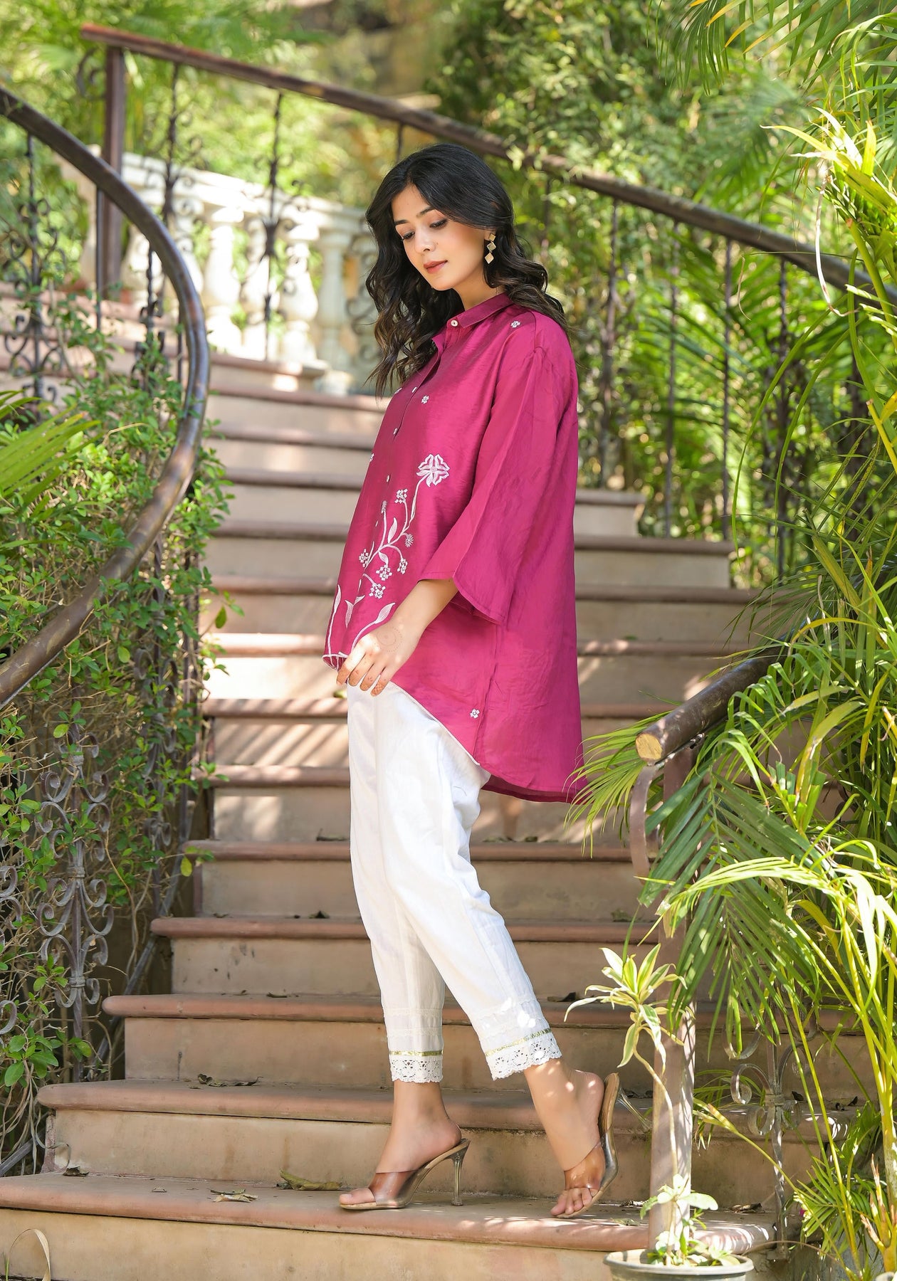 Fuchsia Thread Embroidered Chanderi Tunic Features A Chic Button Closure, High-Low Hem, Hip-Length Fit & Flare Silhouette, Shirt Collar, And Full Bell Sleeves, Offering An Elegant And Contemporary Look.