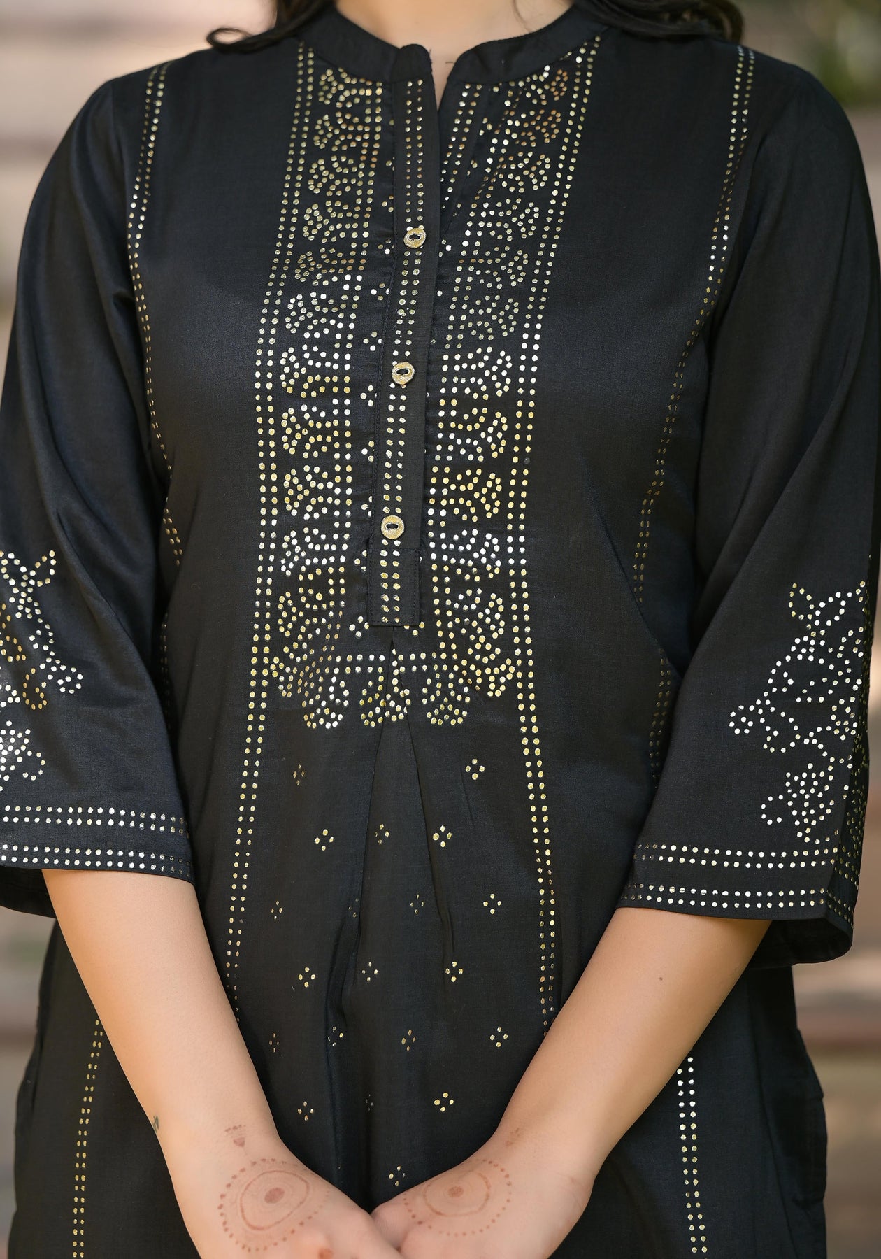 Black Ethnic Motif Printed Silk Tunic Features Button Detailing, A Hip-Length Straight Silhouette, Mandarin Collar, And Three-Quarter Regular Sleeves, Offering A Blend Of Traditional Elegance And Modern Style.