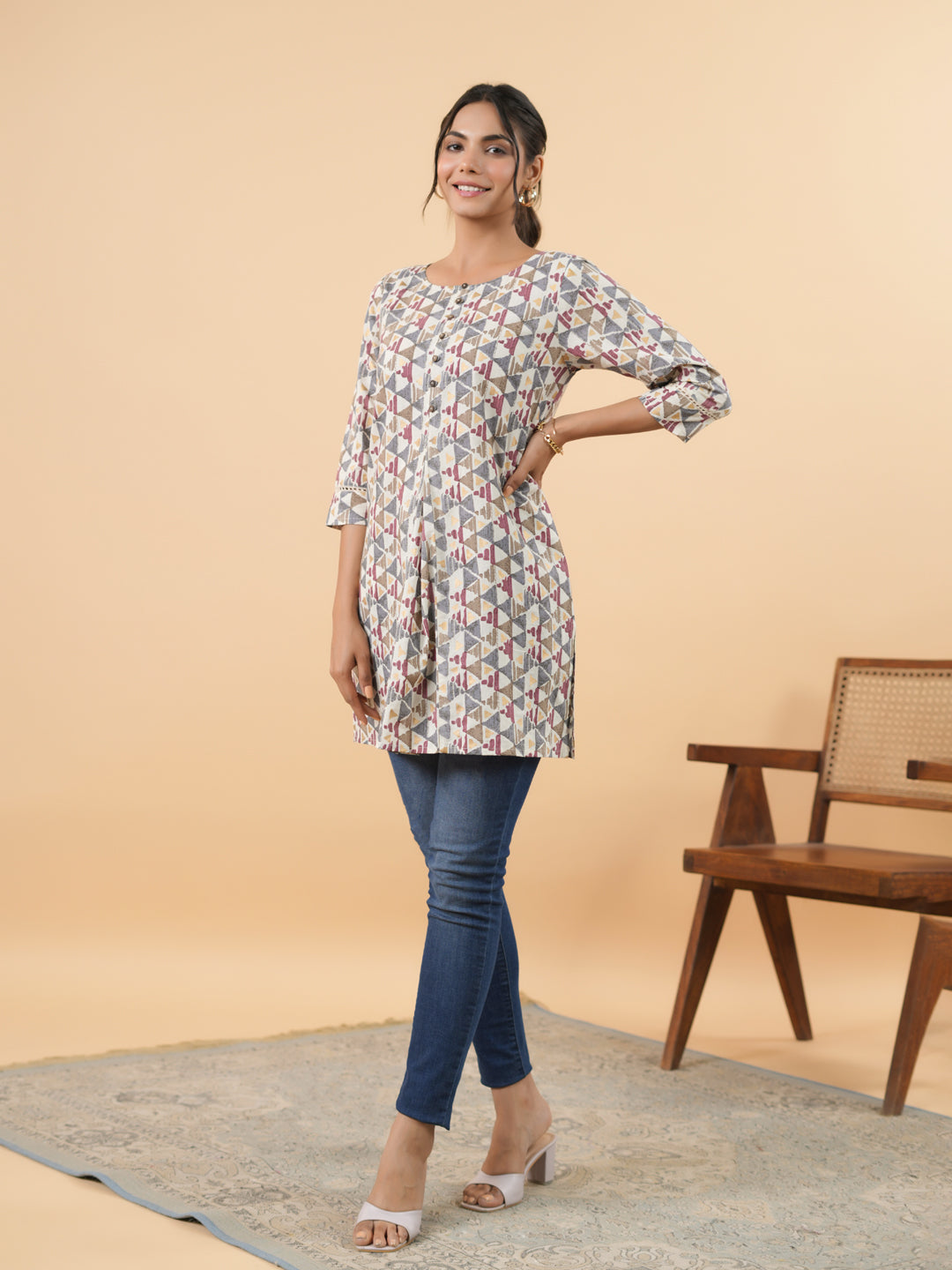Top Details : Style Type :Regular Fabric :Cambric Color :Off White Pattern :Gemometric Neck :Round Neck Sleeve :Three-Quarter Sleeves Length :Above Knee