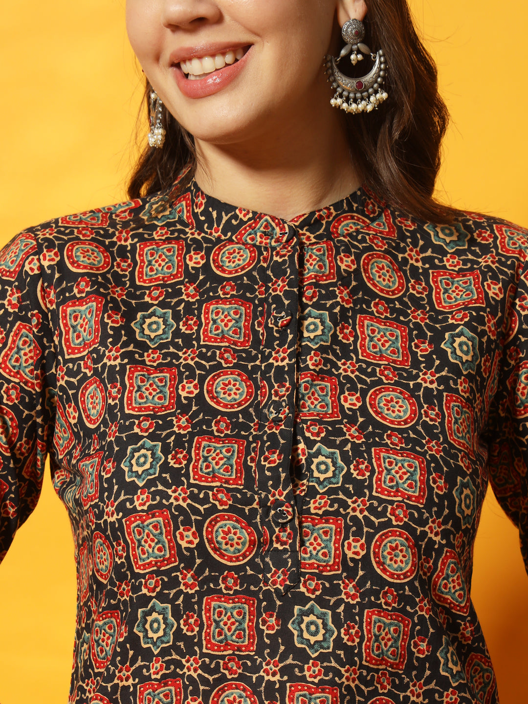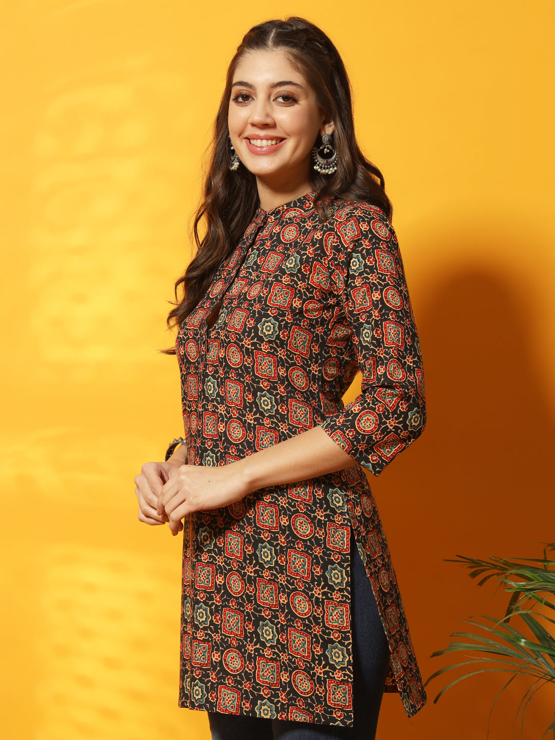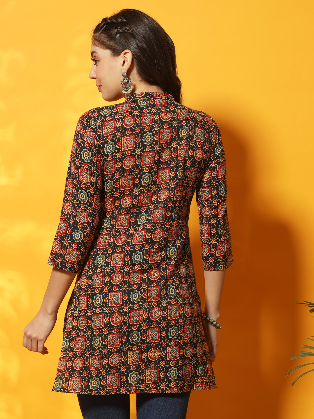Black And Red Mandarin Collared Three Quarter Sleeves Hip Length Short Tunic.
