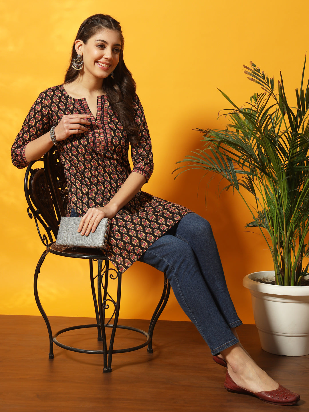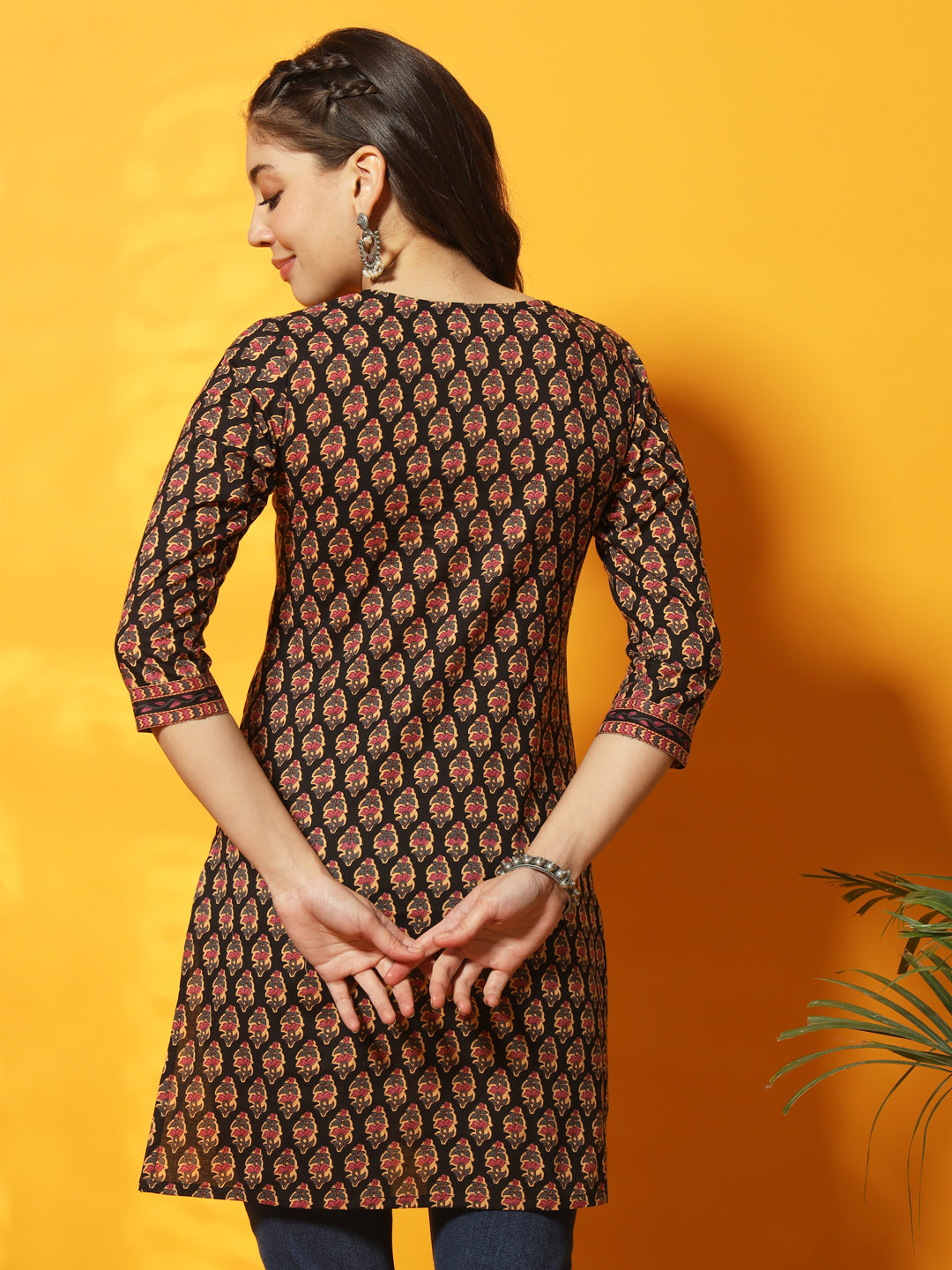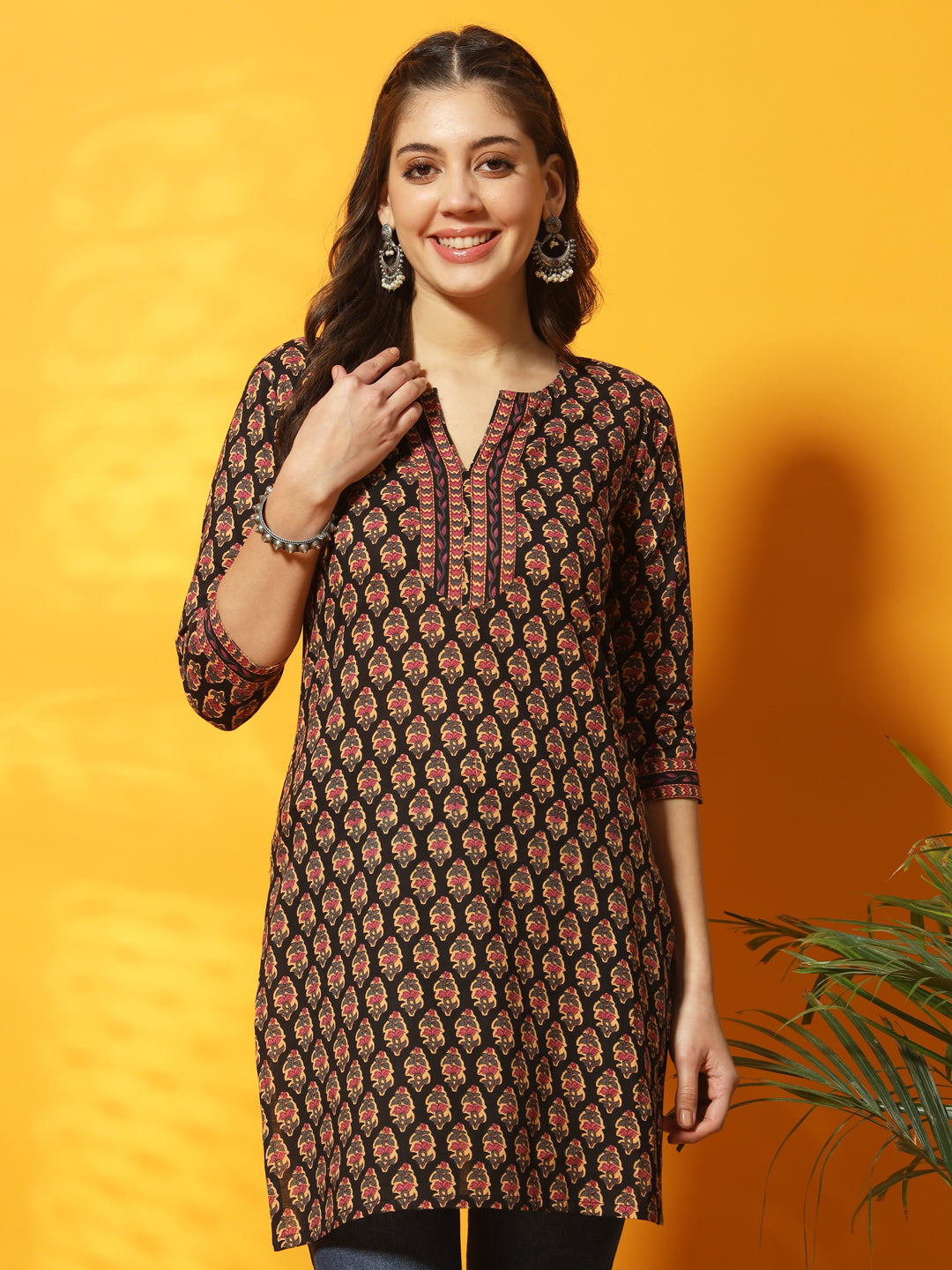 Black And Multi Floral Bagru Printed Round Neck Three Quarter Sleeves Tunic With Side Slits