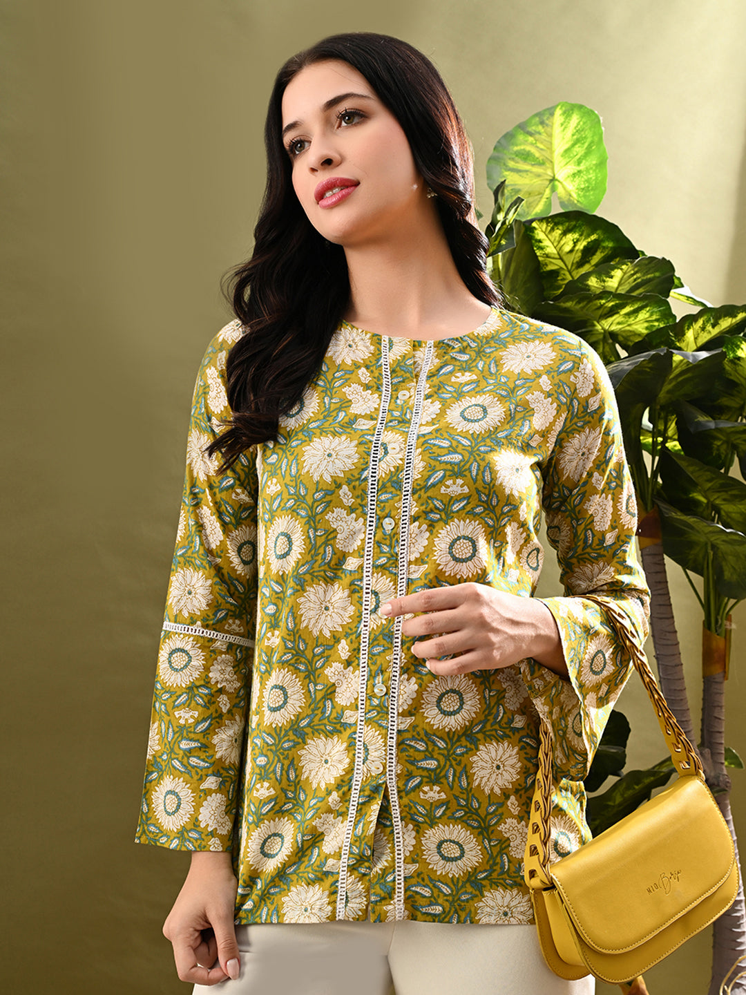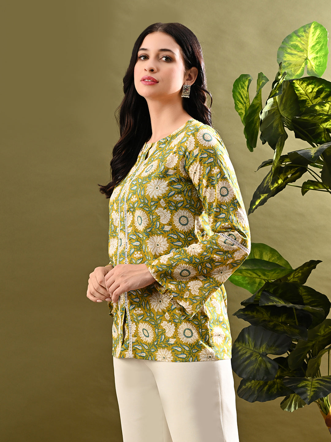 Top Details : Fabric :Cotton Color :Green Shape :Relaxed Work :Printed Neck Line :Round Neck Length :25